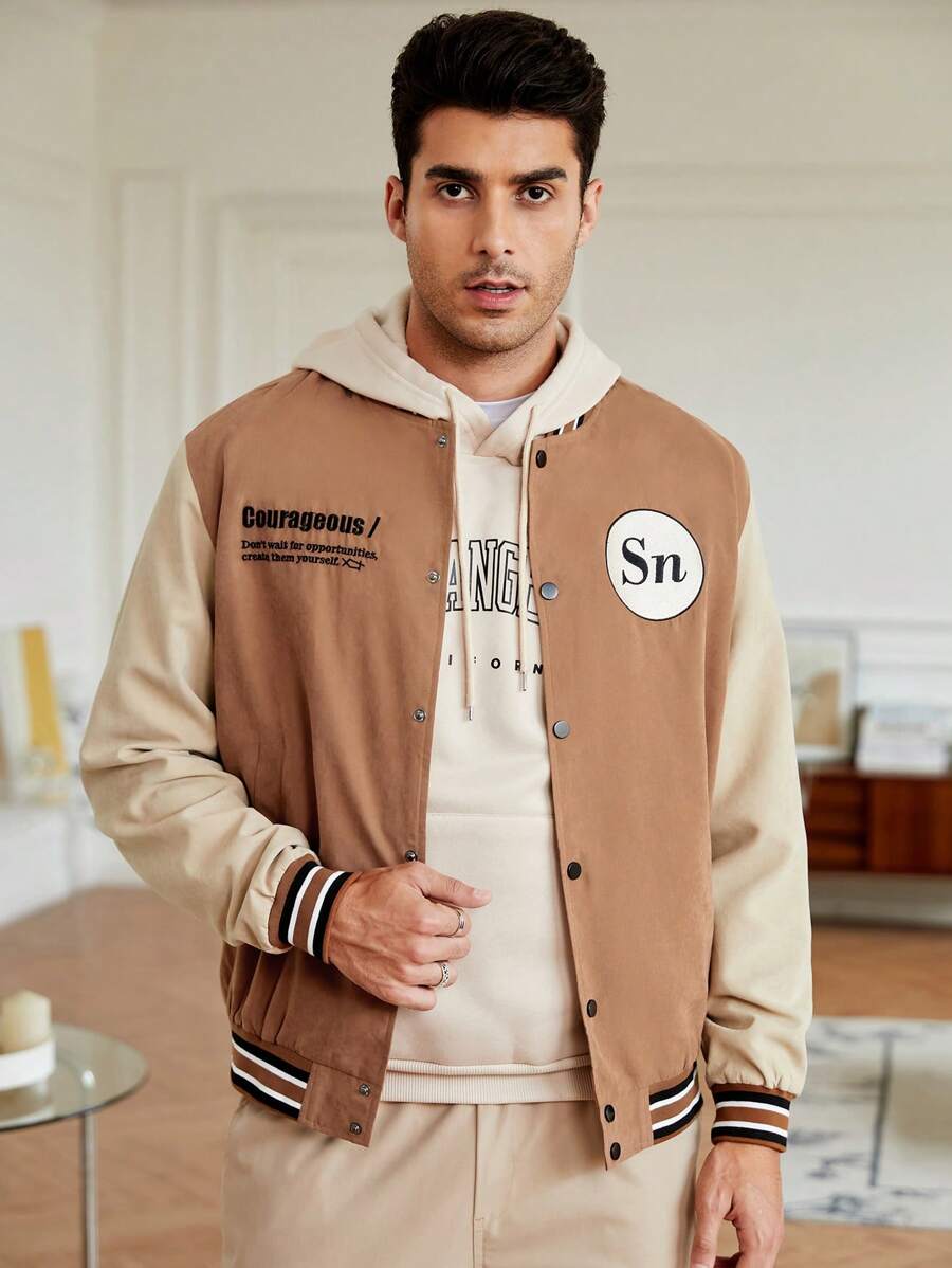 Chaqueta Universitaria Para Hombres Con Eslogan Gráfico Y Ribetes De Rayas Sin Capucha