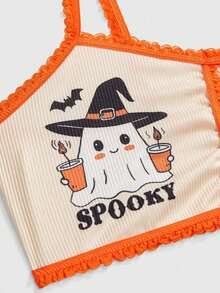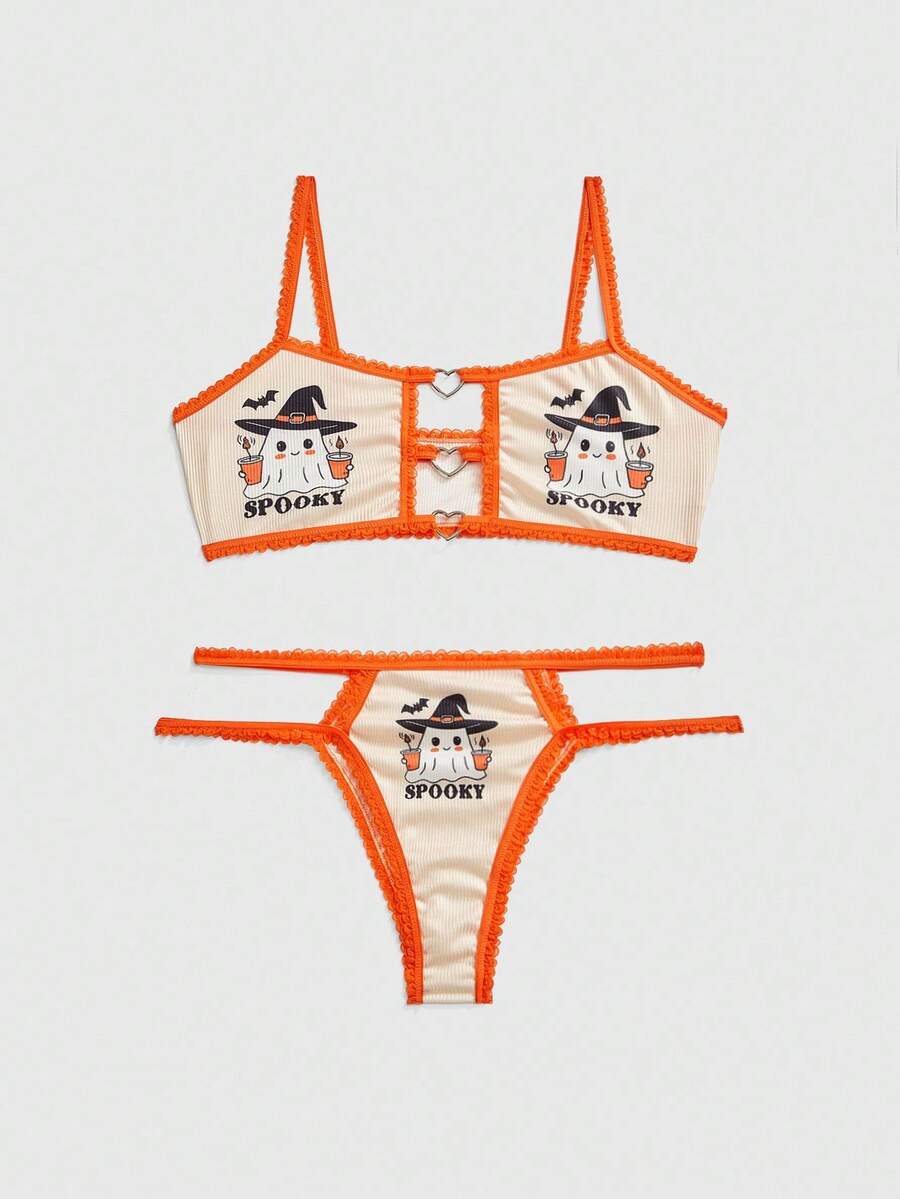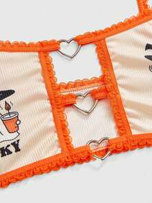 Conjunto de lencería de sujetador y tanga con hebillas metálicas de fantasma, murciélago, vela y corazón de dibujos animados de Halloween