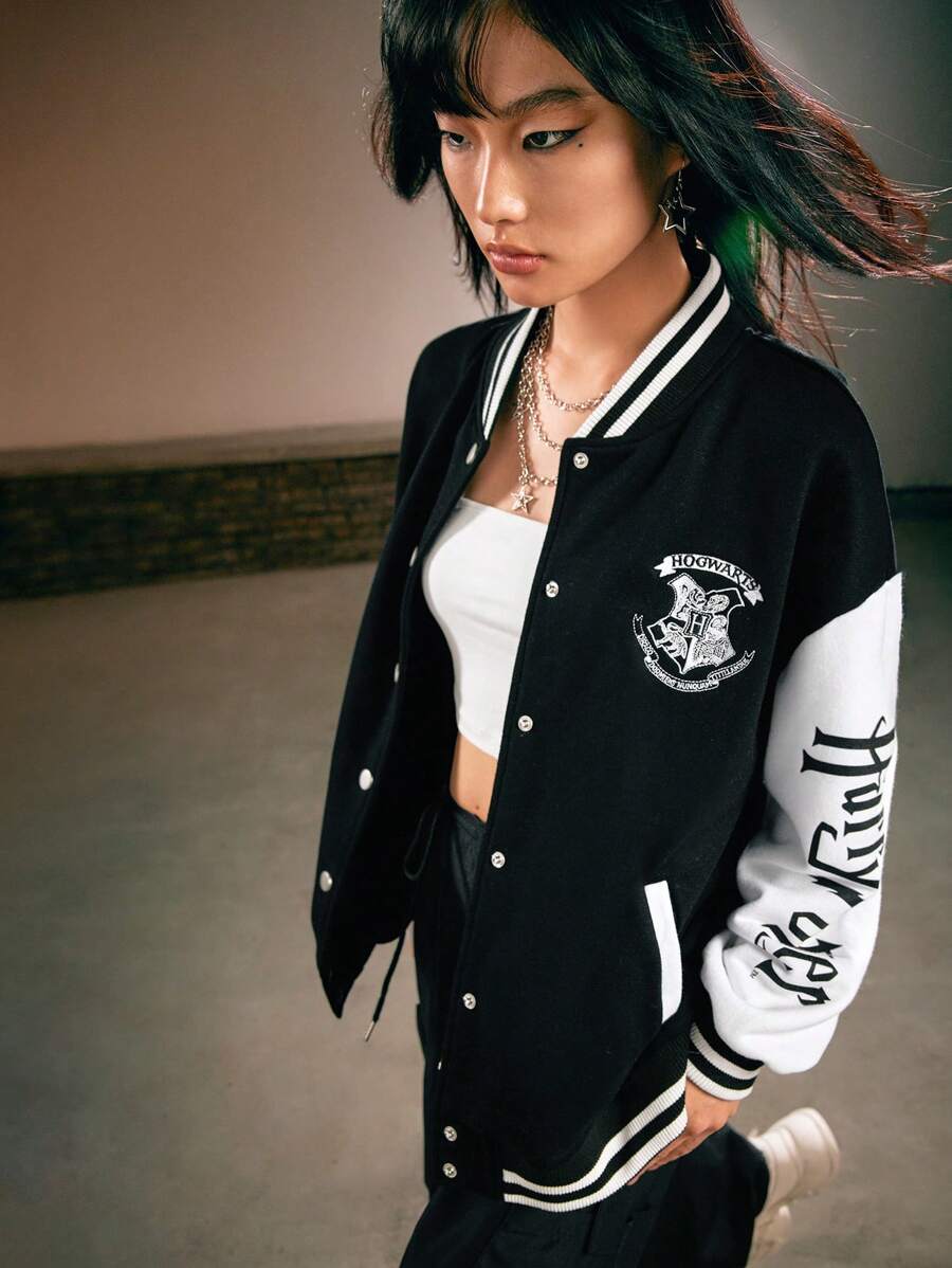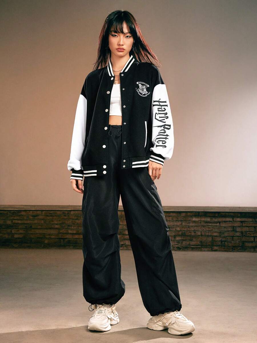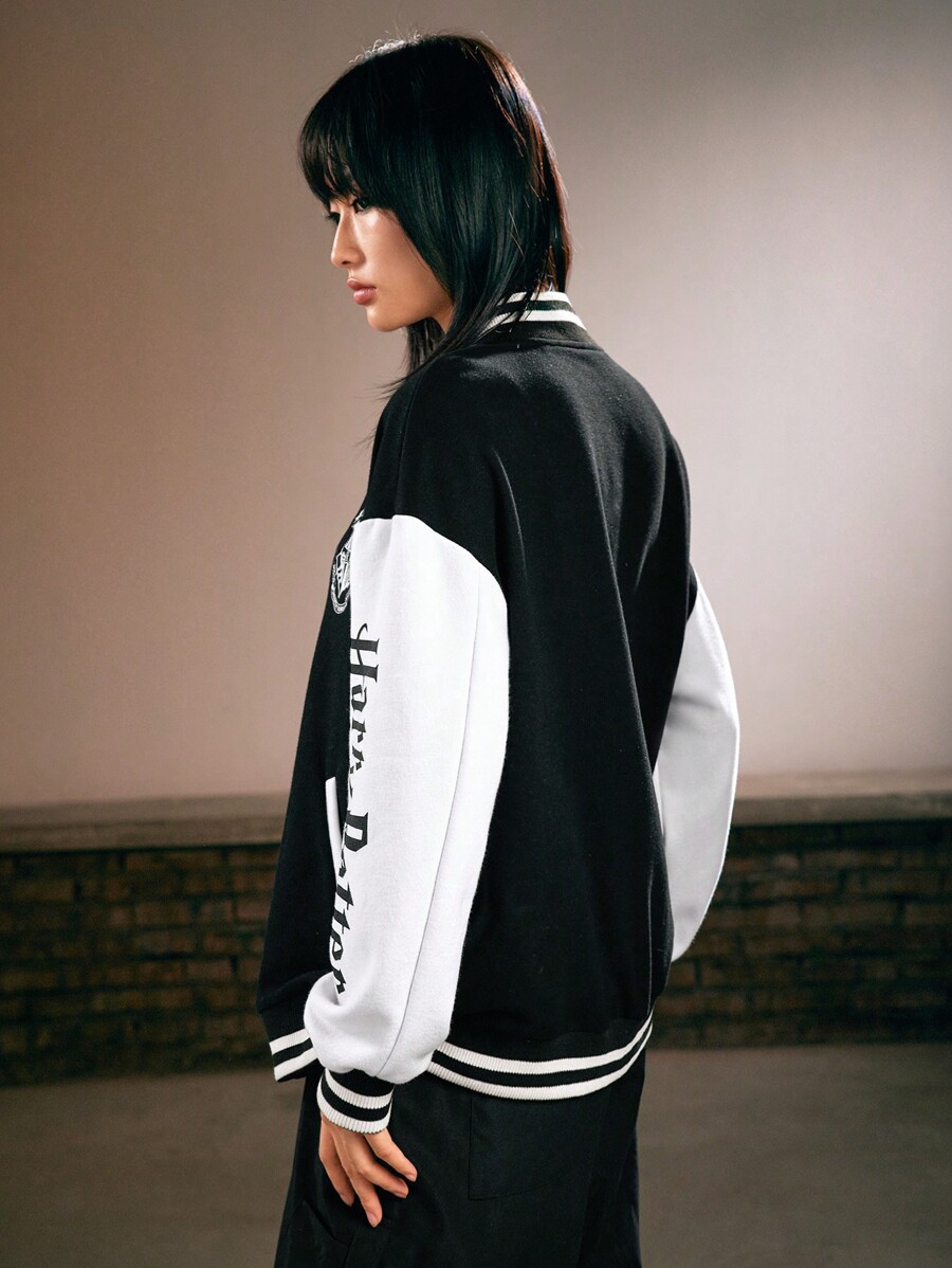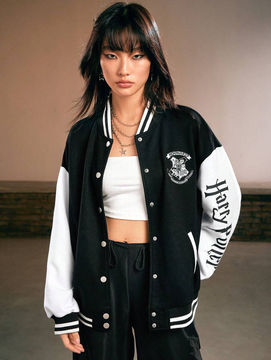 Harry Potter | ROMWE Chaqueta de béisbol de letra con contraste en los hombros caídos, escolar