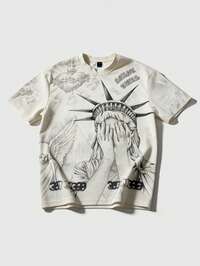 Street Life Camiseta de corte recto estampada con bordes sin terminar, de estilo suelto para hombres