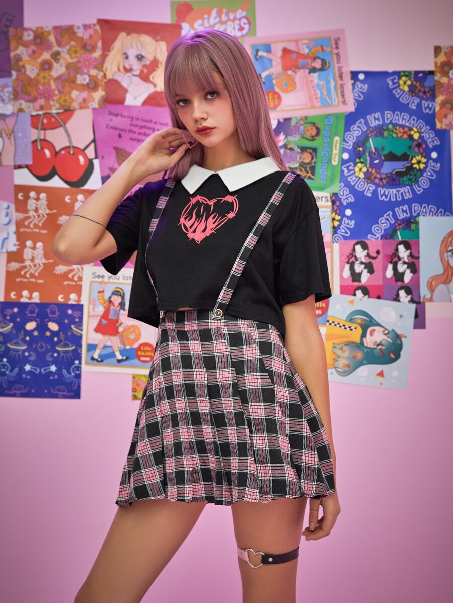 Camiseta con estampado de corazón de cuello en contraste & Falda de cuadros