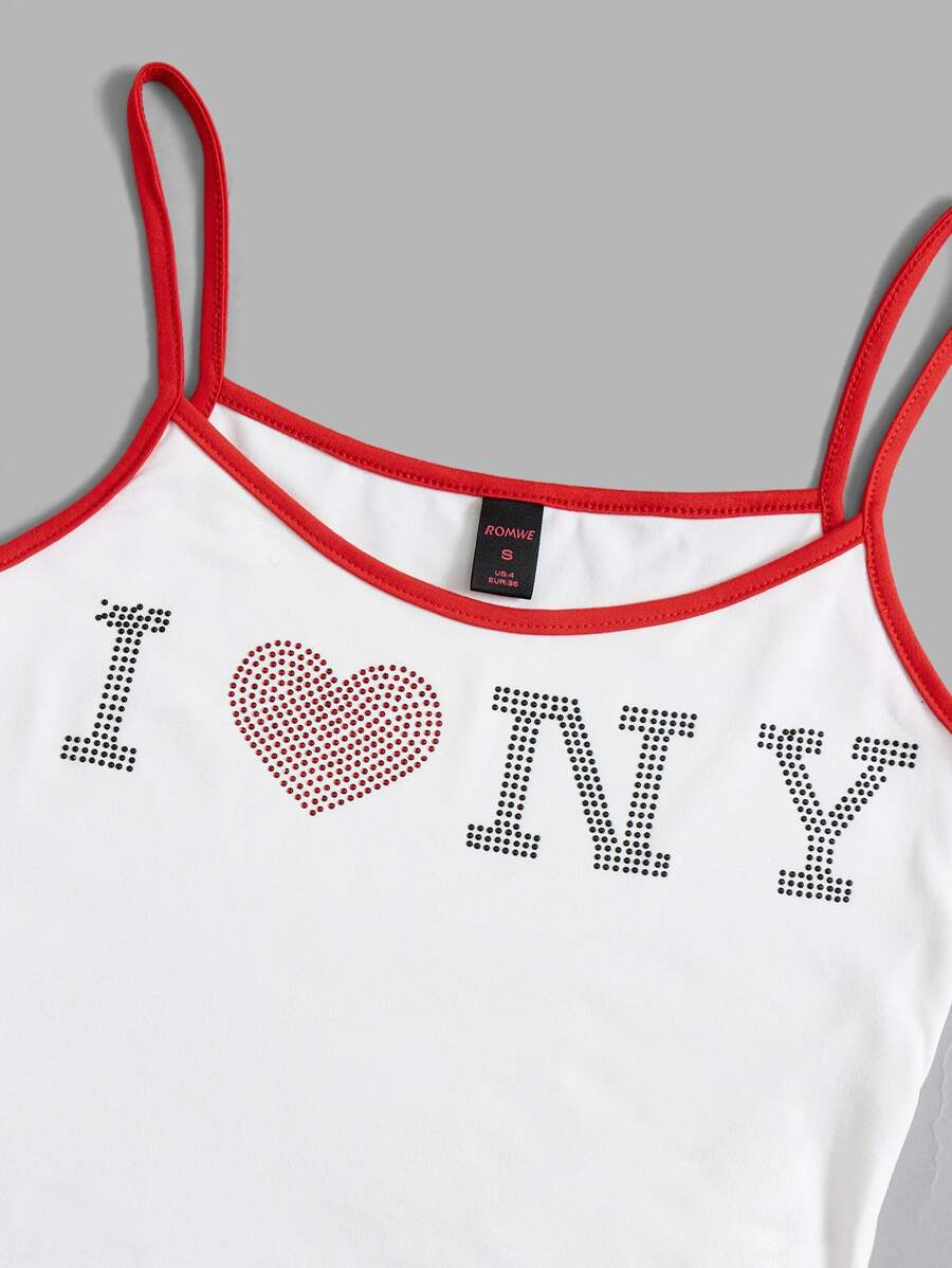 Top de tirante camisero con gráfico de corazón y letra, incrustaciones de diamante de imitación y ribetes de contraste