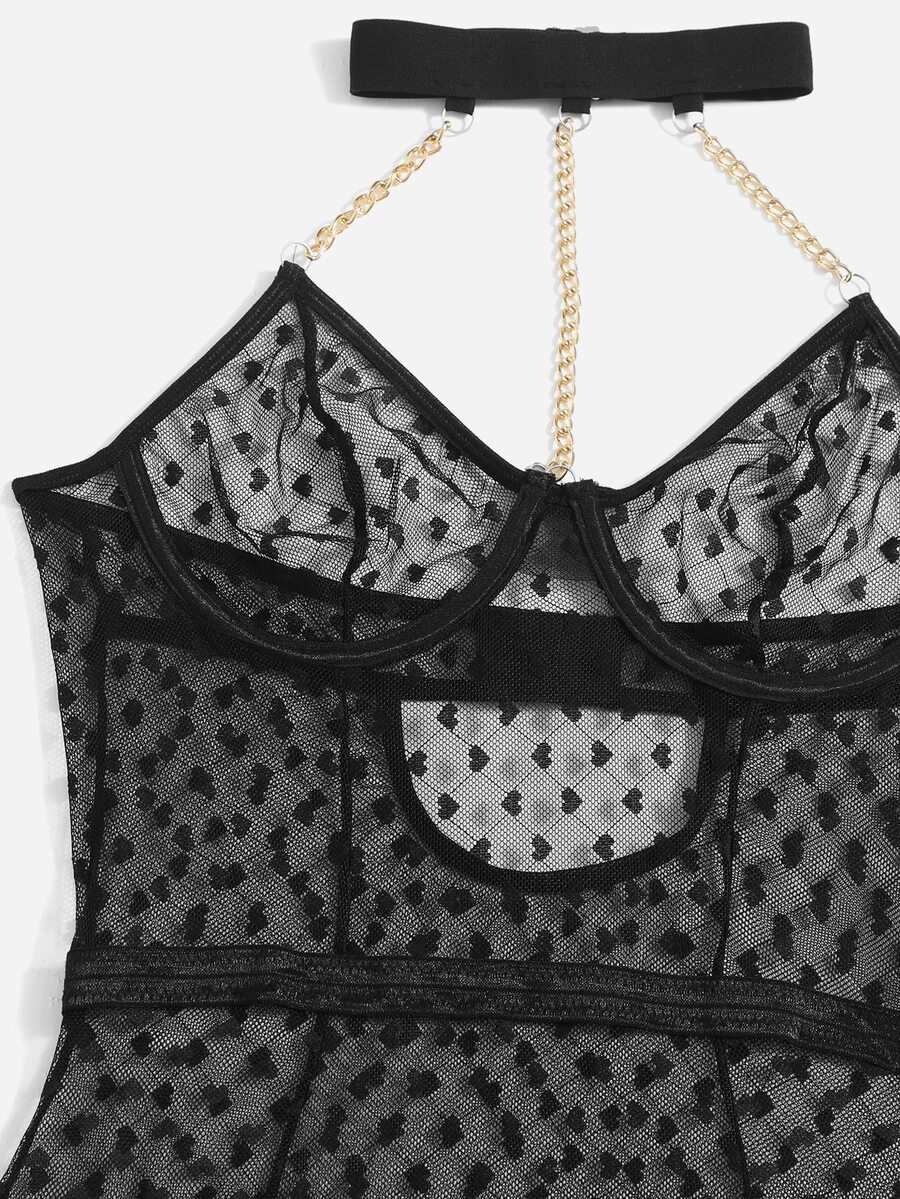 Body teddy con patrón de corazón de malla con abertura vinculado con cadena