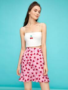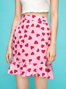 Falda Estampada De Corazones Con Dobladillo De Volantes