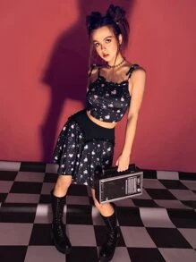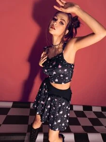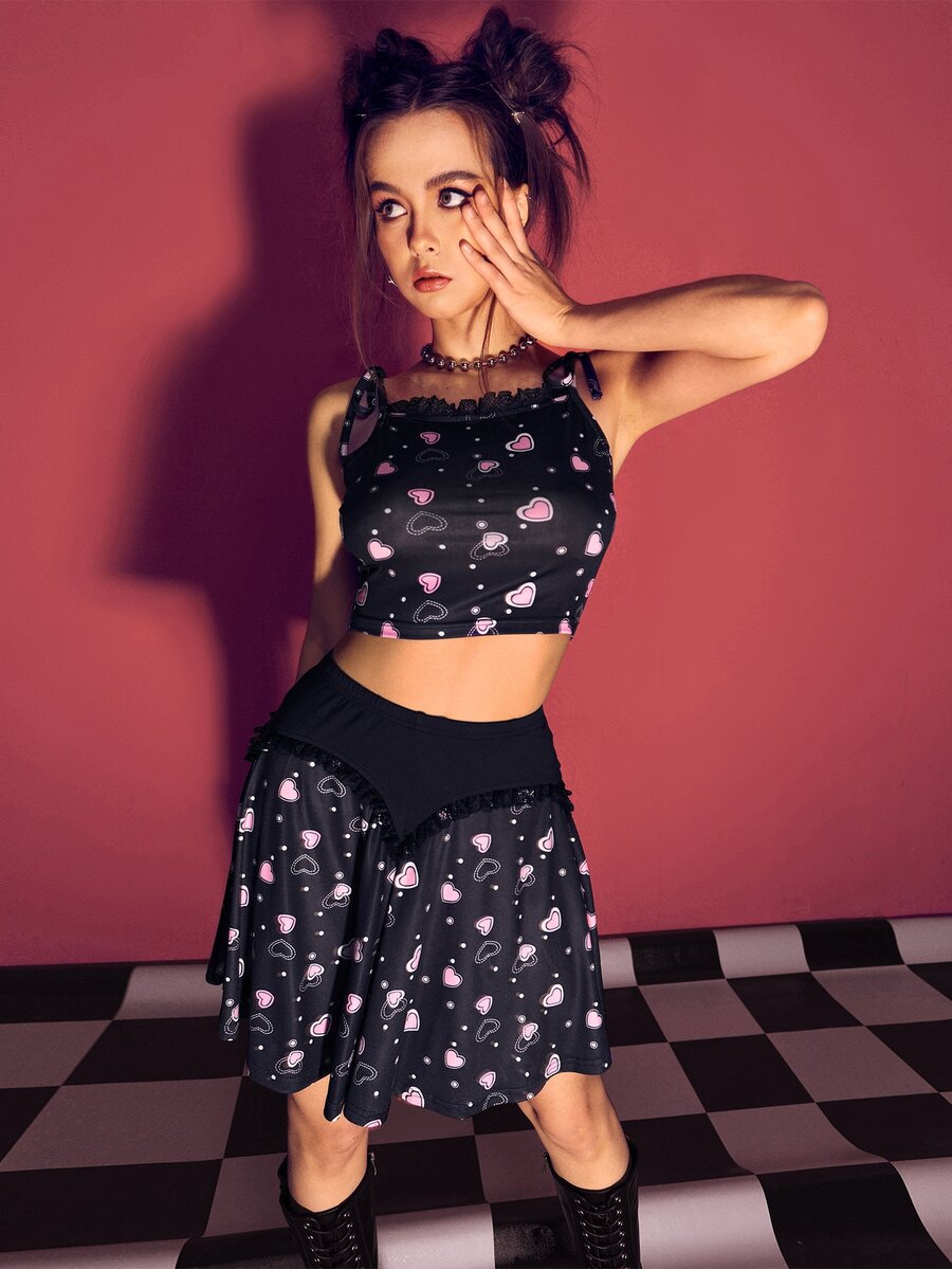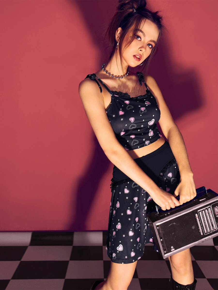 con estampado de corazón de hombros con cordón Cami & fruncido Falda