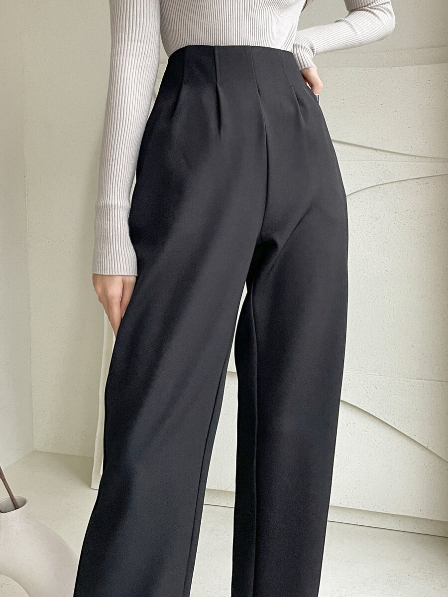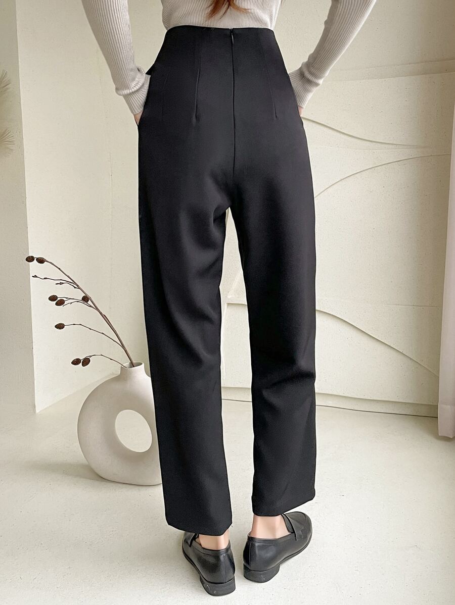 Pantalones casuales de mujer con bolsillos y pliegues en unicolor, pantalones elegantes de otoño tardío con pliegues, bolsillos y cremallera, pantalones rectos de cintura alta y pierna larga en color negro, ajuste recto para mujer, atuendo profesional/de negocios/de trabajo, pantalones de vestir para mujer