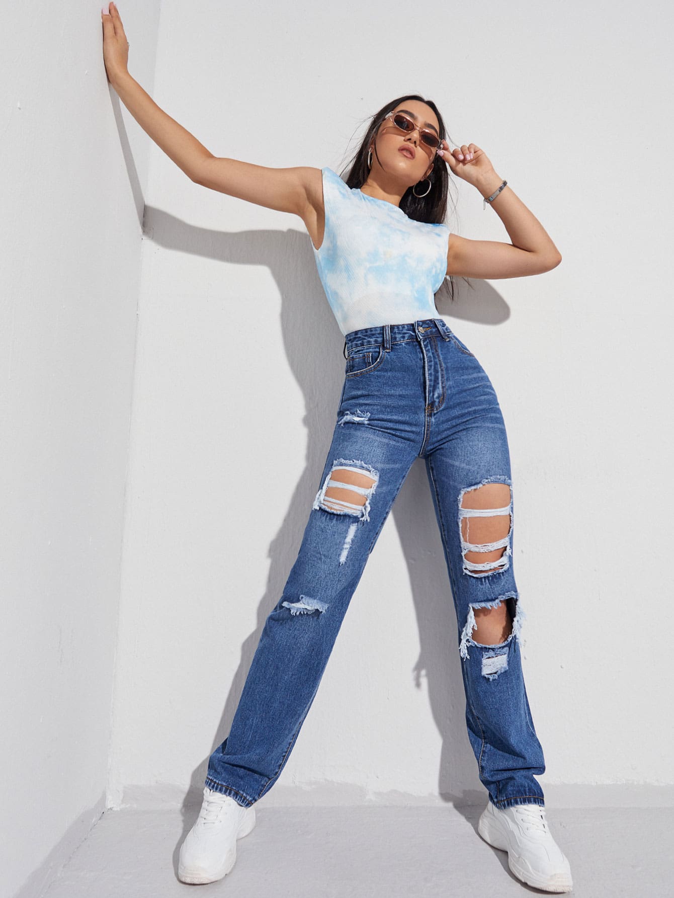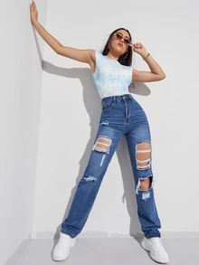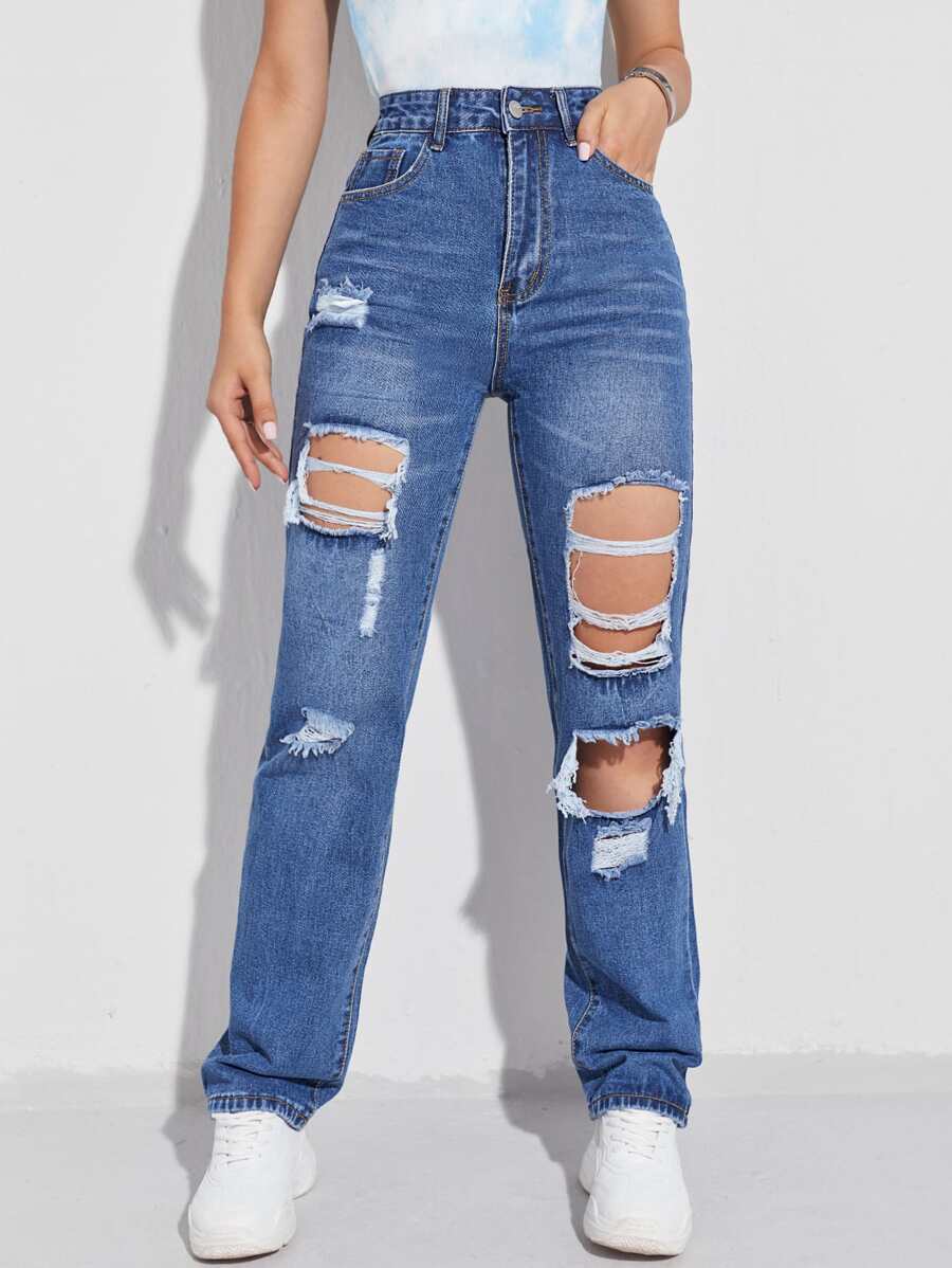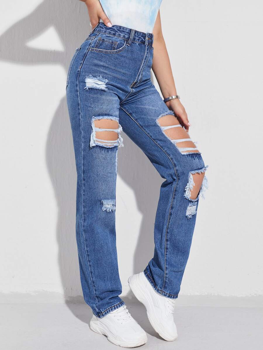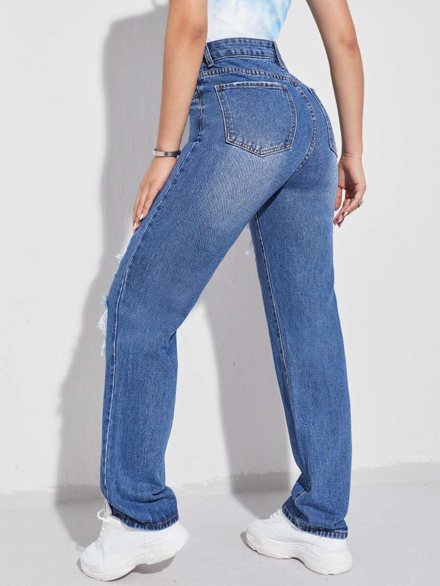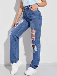 Jeans de pierna recta con diseño roto de cintura alta