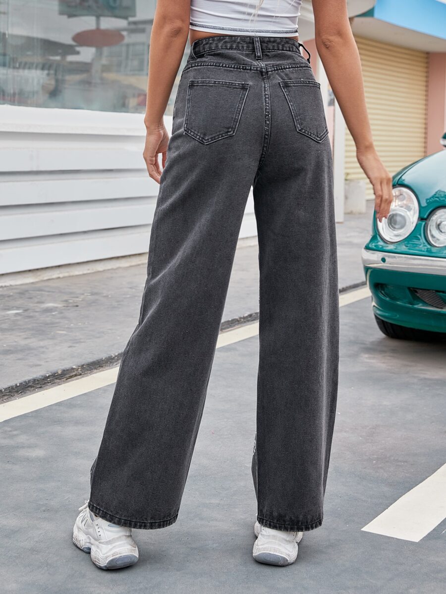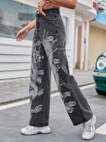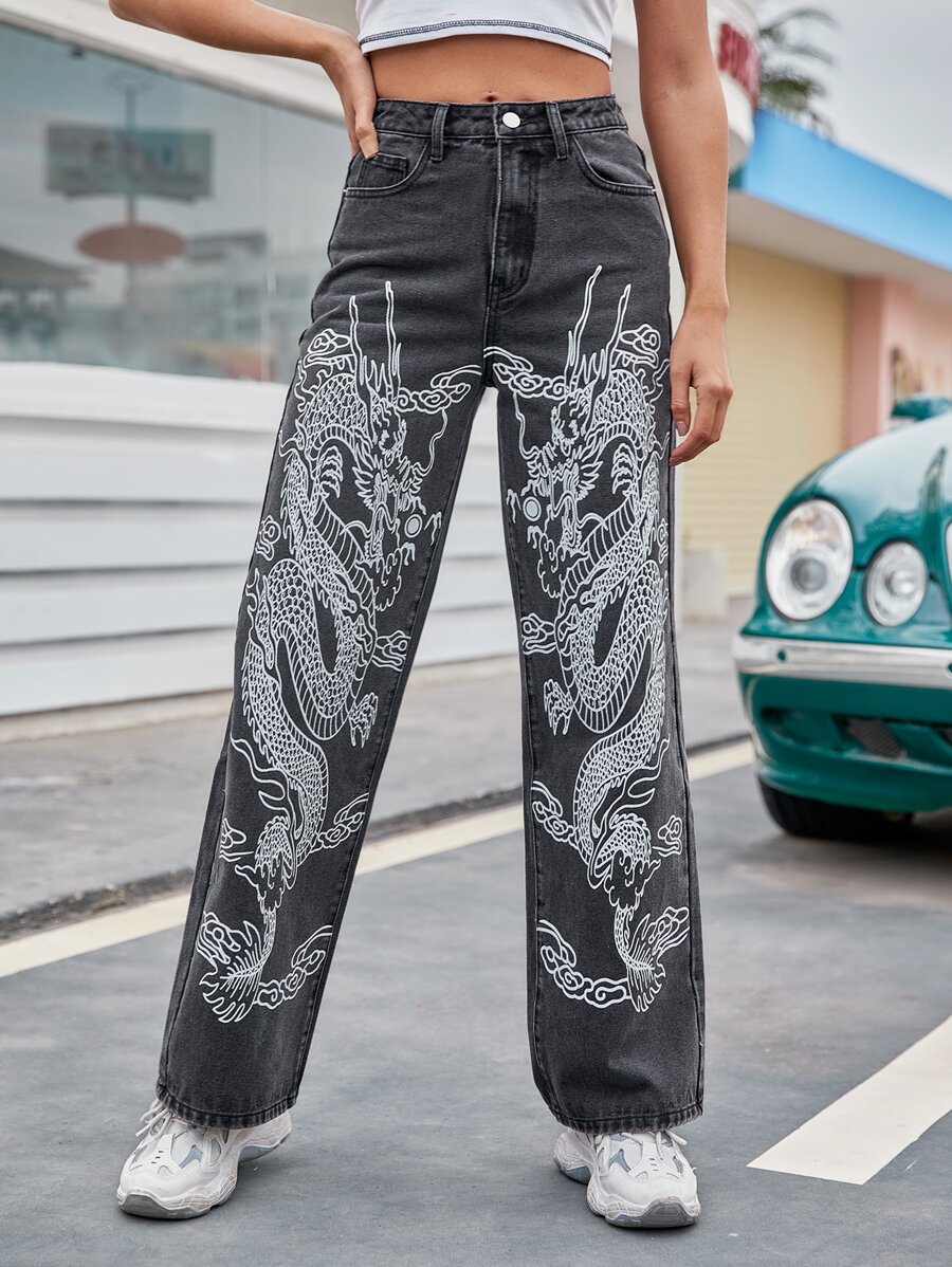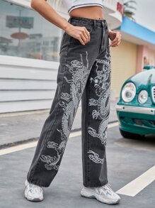 Jeans con estampado de dragón chino de cintura alta
