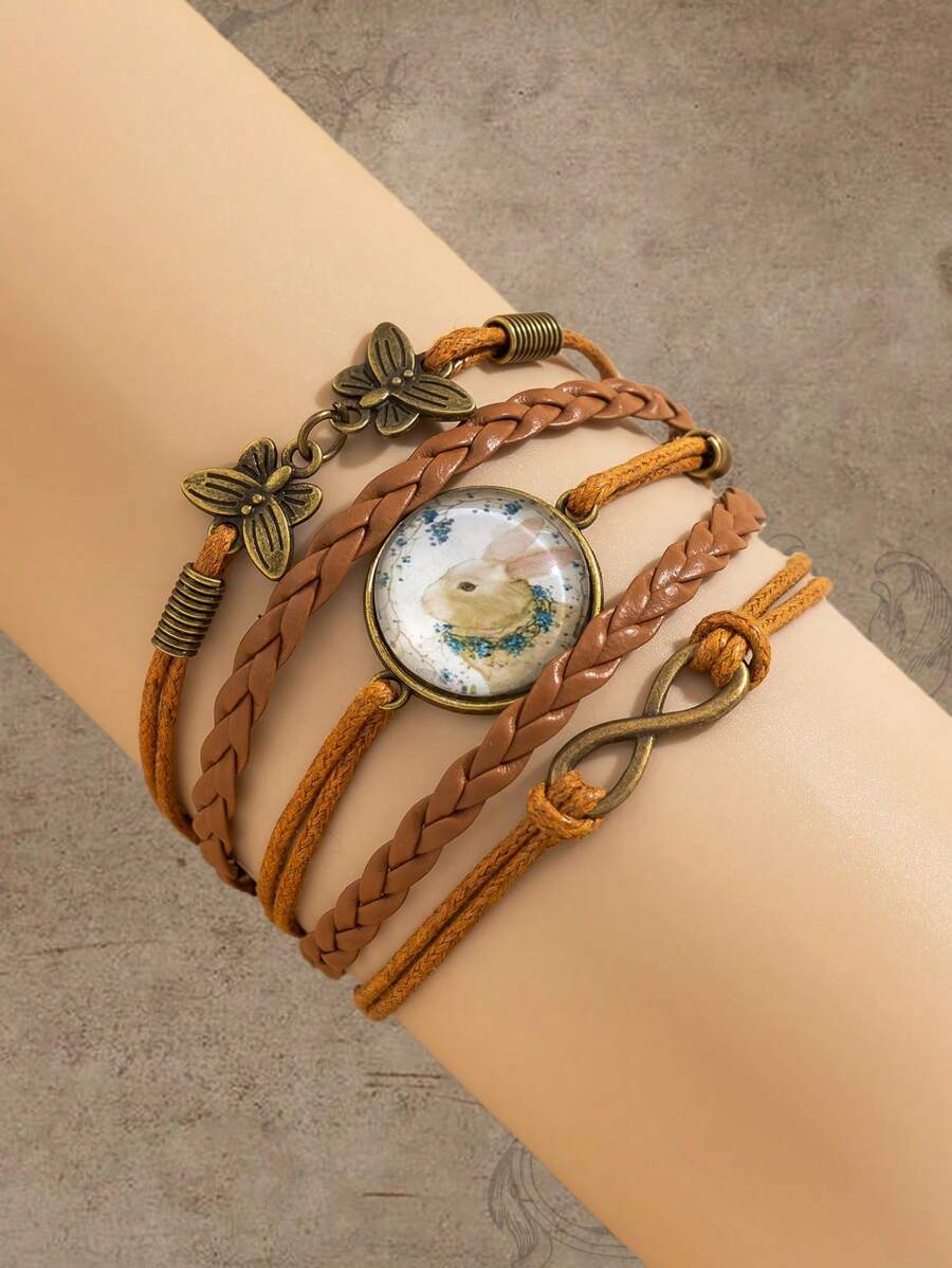 Hippie 1 Pieza Estilo Vintage Y Creativo Bracelete De Cadena PU Trenzado Con Varias Capas, En Forma De Conejo Con Incrustaciones De Mariposas Y Piedras Preciosas Redondas