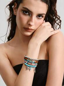 Hippie Set de 5 piezas Pulsera de cuentas de estiramiento retro con decoración de cabeza de toro, bota y hoja de estilo bohemio multicapa, regalo unisex