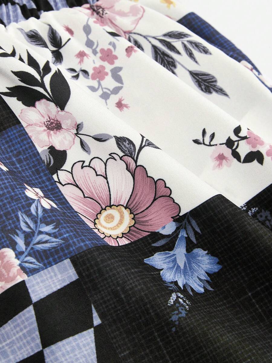 Hippie Shorts floral & de cuadros con estampado de retazo de cintura con nudo