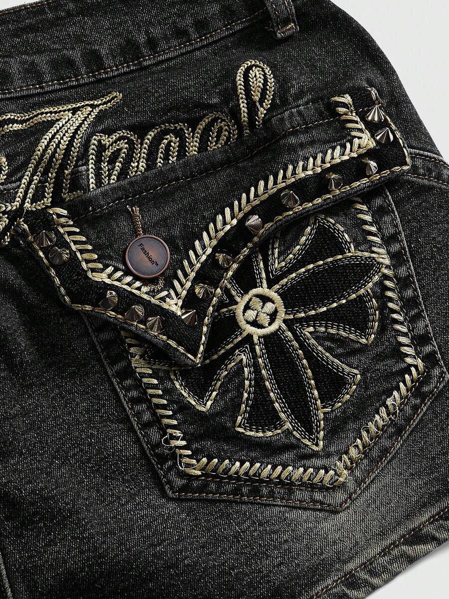 Pantalones cortos vaqueros con parches bordados estilo hippie, bolsillos y estampado de inglés