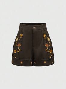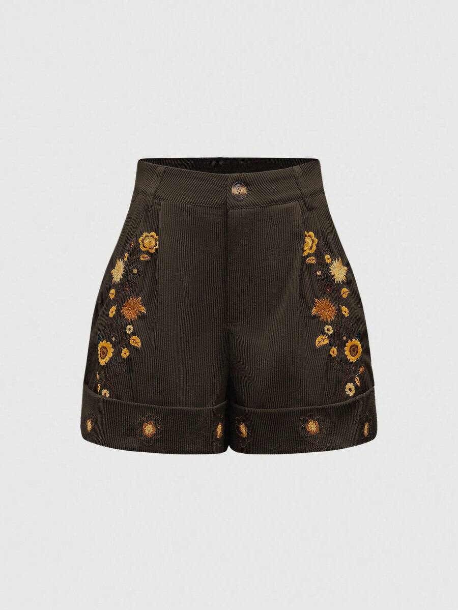 Hippie Pantalones cortos anchos y sueltos de mujer talla grande con bordado floral bohemio y plisados