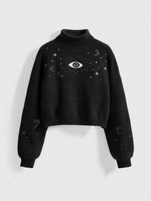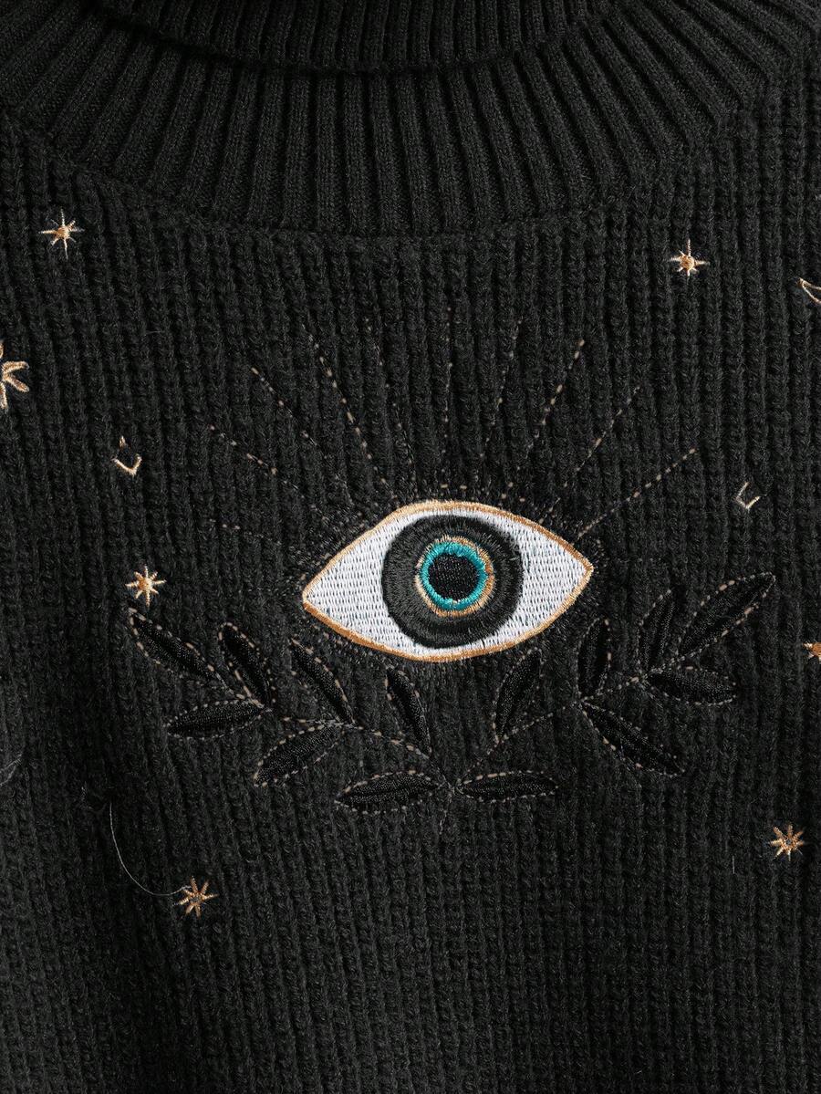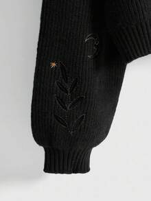 Hippie Suéter de cuello redondo con bordado de luna y estrellas en estilo retro bohemio y de vacaciones, en azul-verde