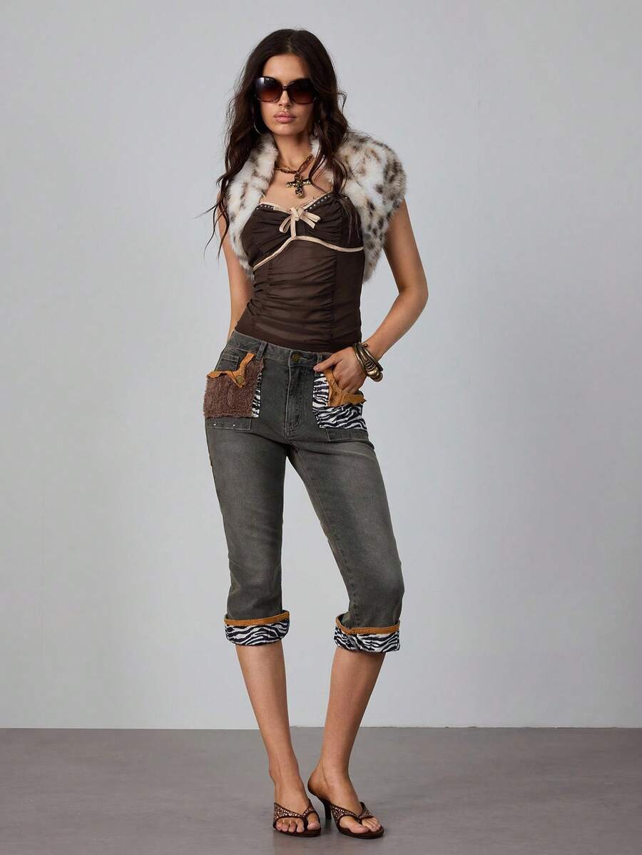 Hippie Top tipo camiseta de tirantes ajustable, plisado, de malla suave, color marrón translúcido y con detalles de pedrería