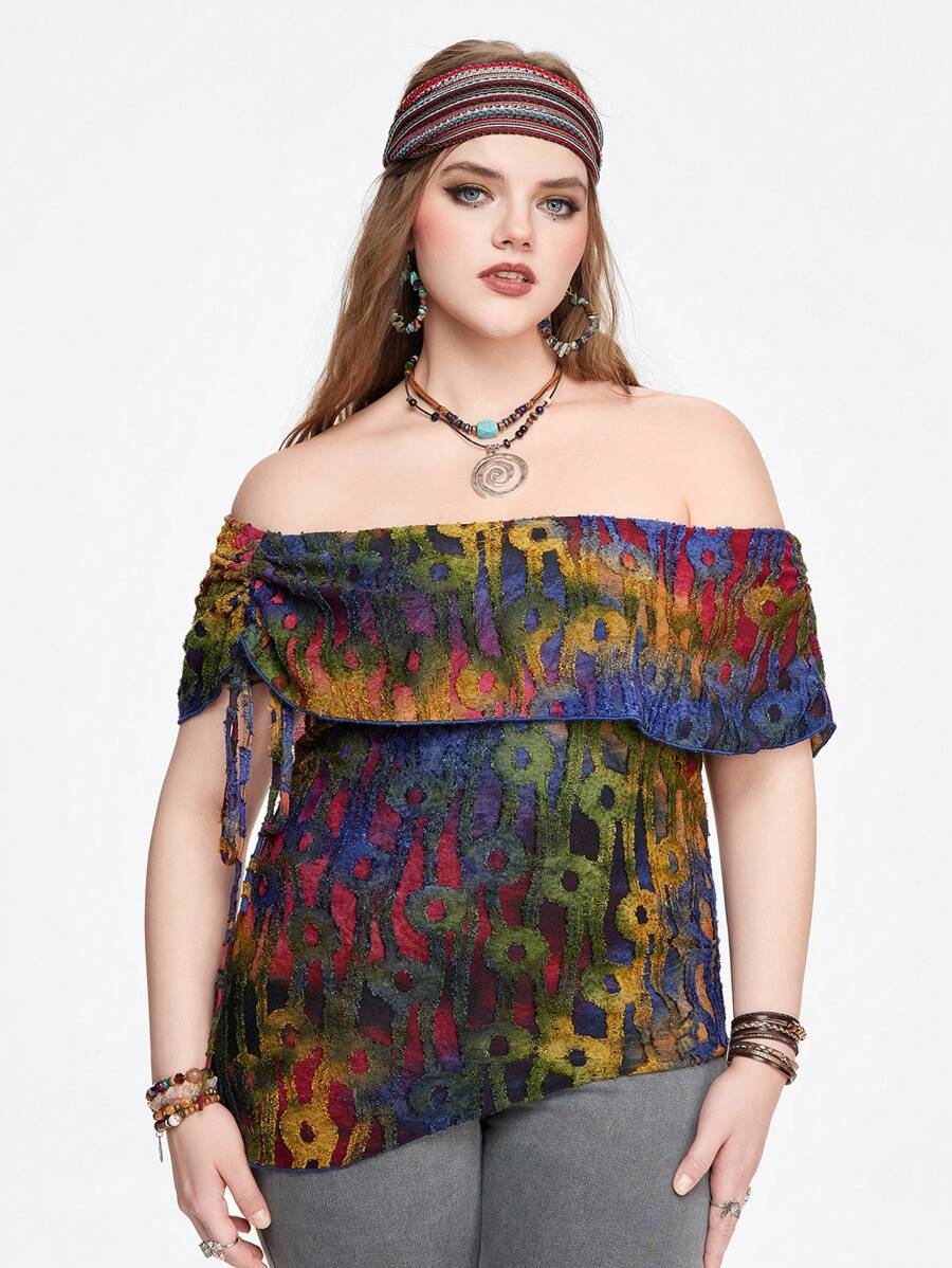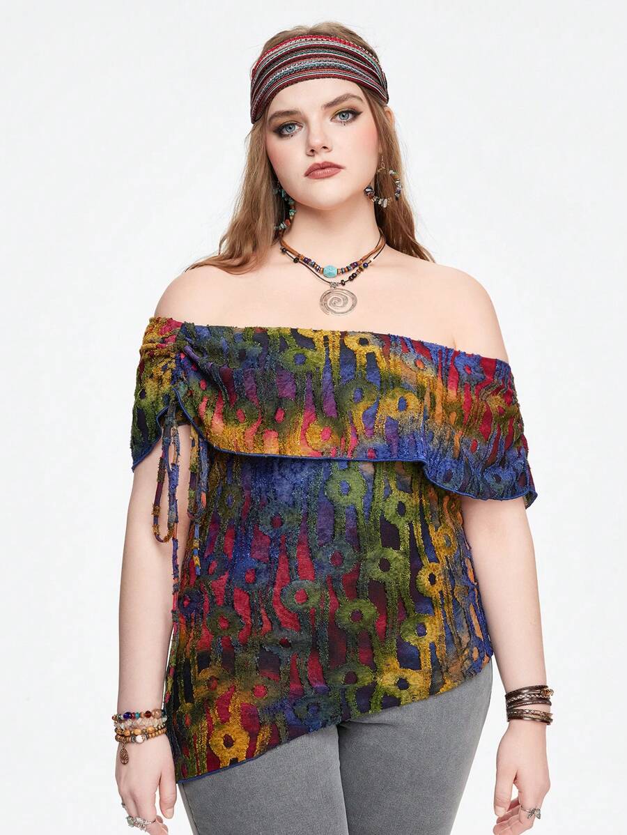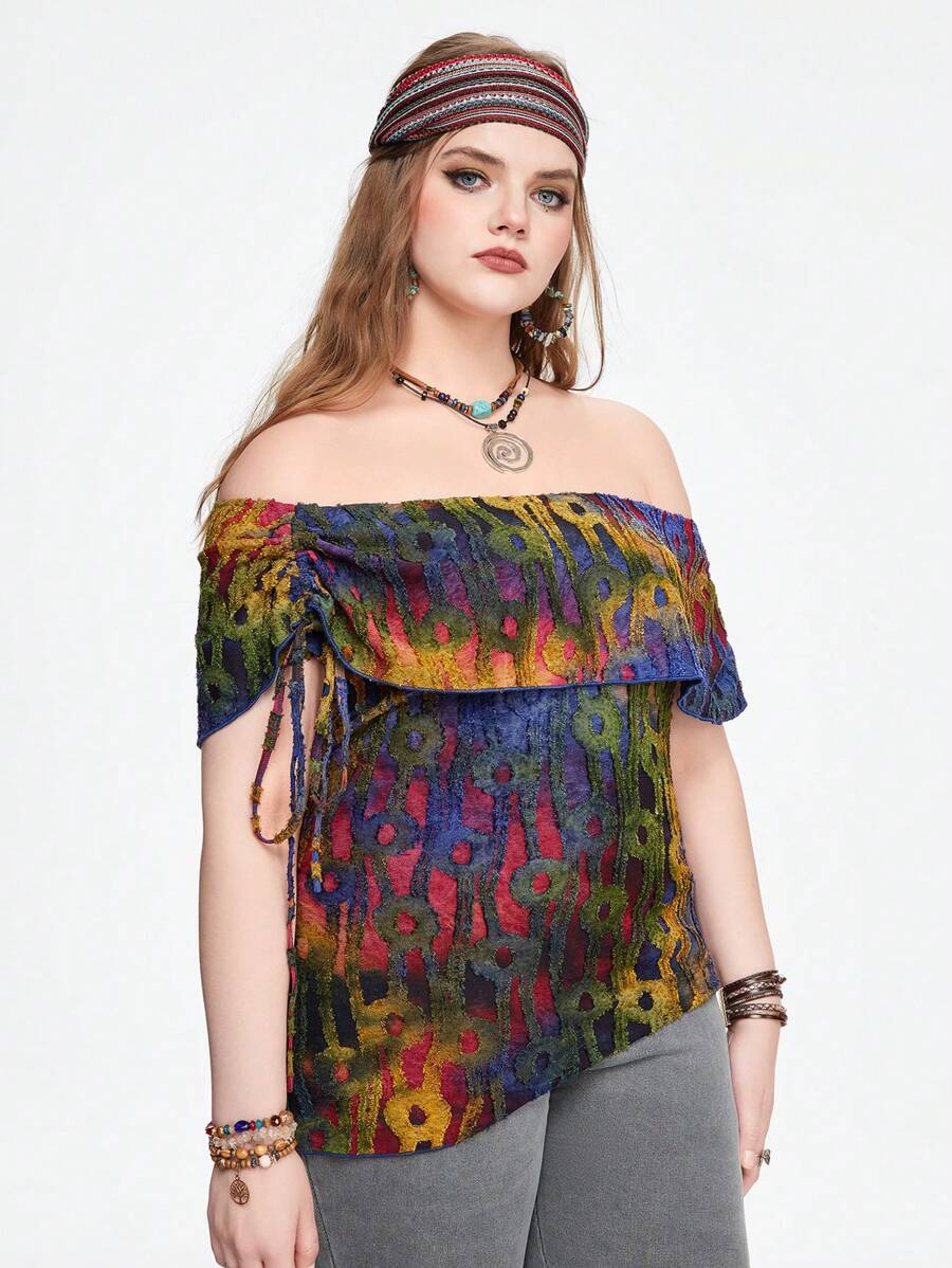 Hippie Camisa de manga corta con hombros descubiertos en talla grande, bajo asimétrico y flecos, en estilo teñido anudado vintage