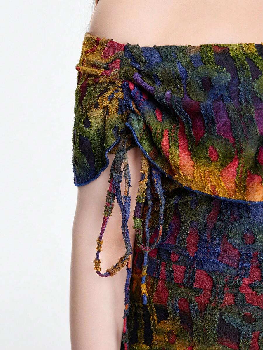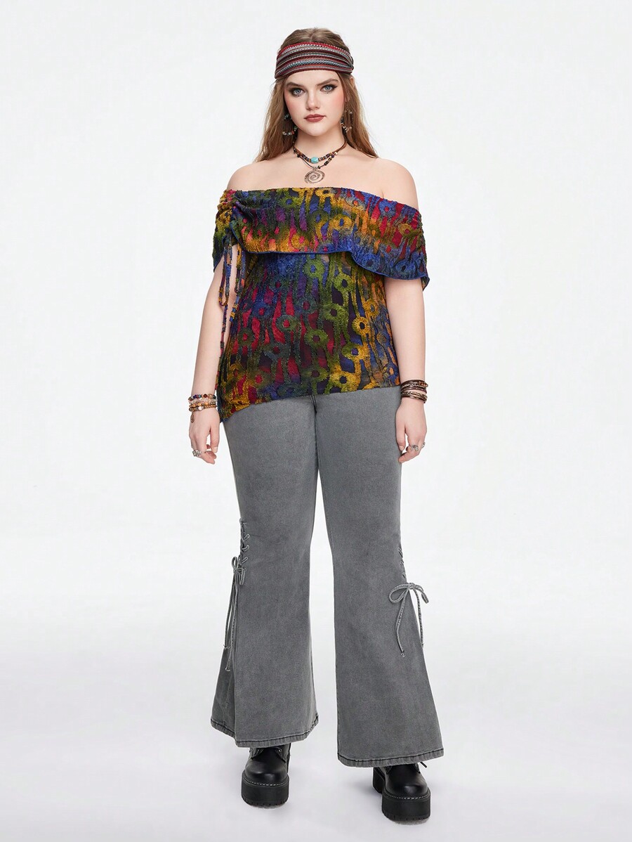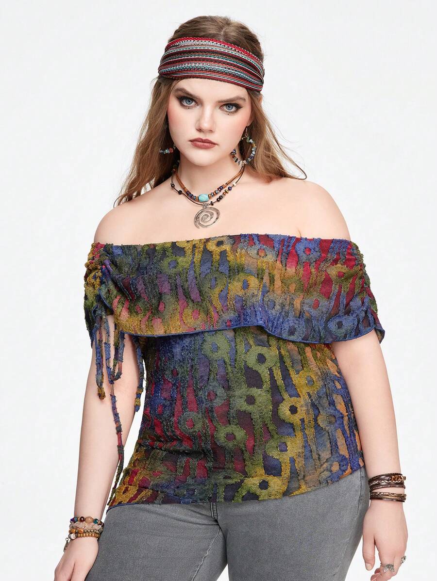 Hippie Camisa de manga corta con hombros descubiertos en talla grande, bajo asimétrico y flecos, en estilo teñido anudado vintage