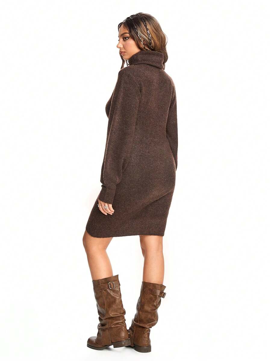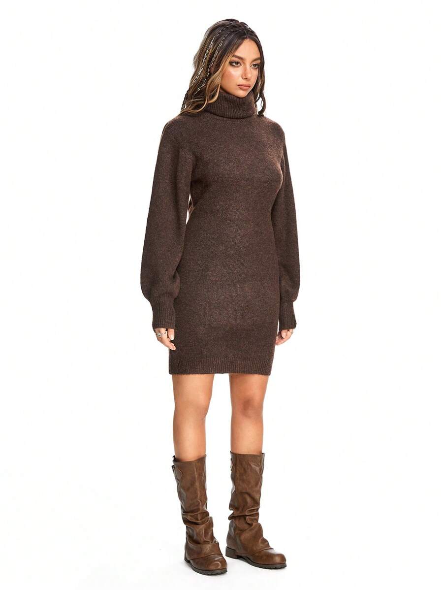 Hippie Vestido de suéter de cuello alto de unicolor para mujer, informal, otoño/invierno