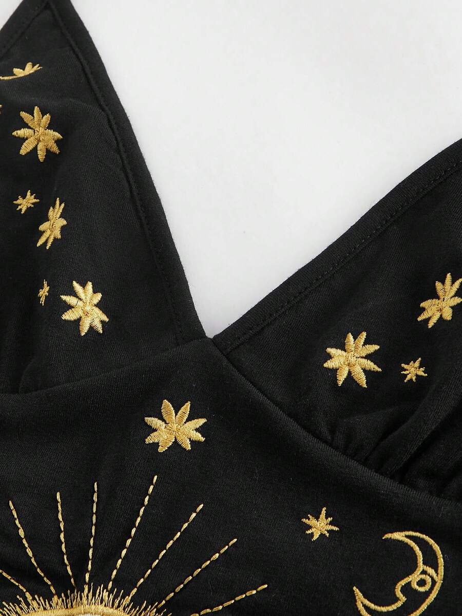 Hippie Parte superior de tirantes estilo tanque con bordado de ojo, luna y estrella, acabado en cuentas, en color cían, con estilo bohemio-chic de vacaciones para mujer