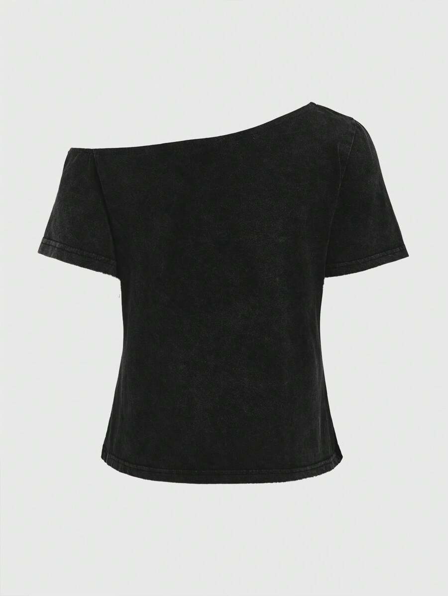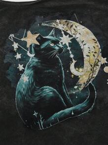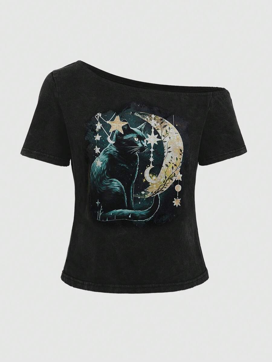 Hippie Camiseta De Mujer Con Cuello Asimétrico Y Estampado De Luna Y Gato