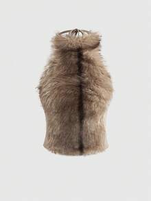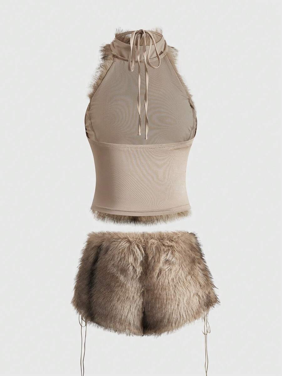 Hippie Conjunto de 2 piezas de top corto ajustado y sexy con halter de piel de colores degradados y shorts bajos de piel para mujer