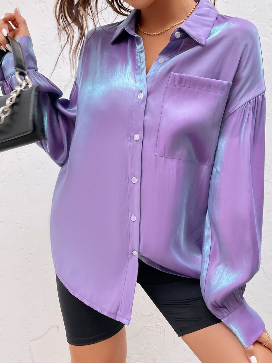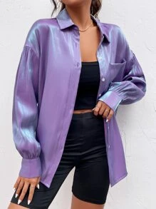 Blusa de satén para mujer con hombros caídos, parche y bolsillo holográfico