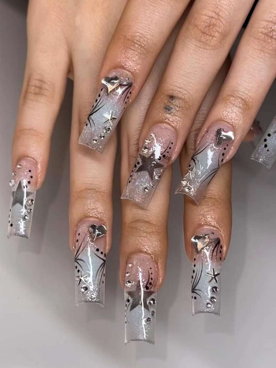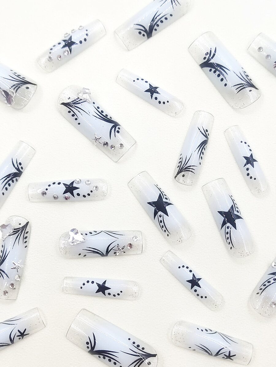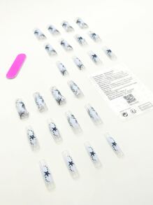 Actualice instantáneamente su aspecto con 24 piezas de uñas postizas con estampado de estrellas y corazones de diamantes de imitación cuadrados largos y 1 lima de uñas y 1 hoja de cinta