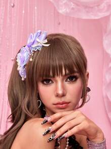 J-Fashion 1 pieza Pasador de cabello con moño y estrella morados con cuentas, pasador de flor de encaje lindo, accesorios de cabello estilo lolita hechos a mano con perlas y strass