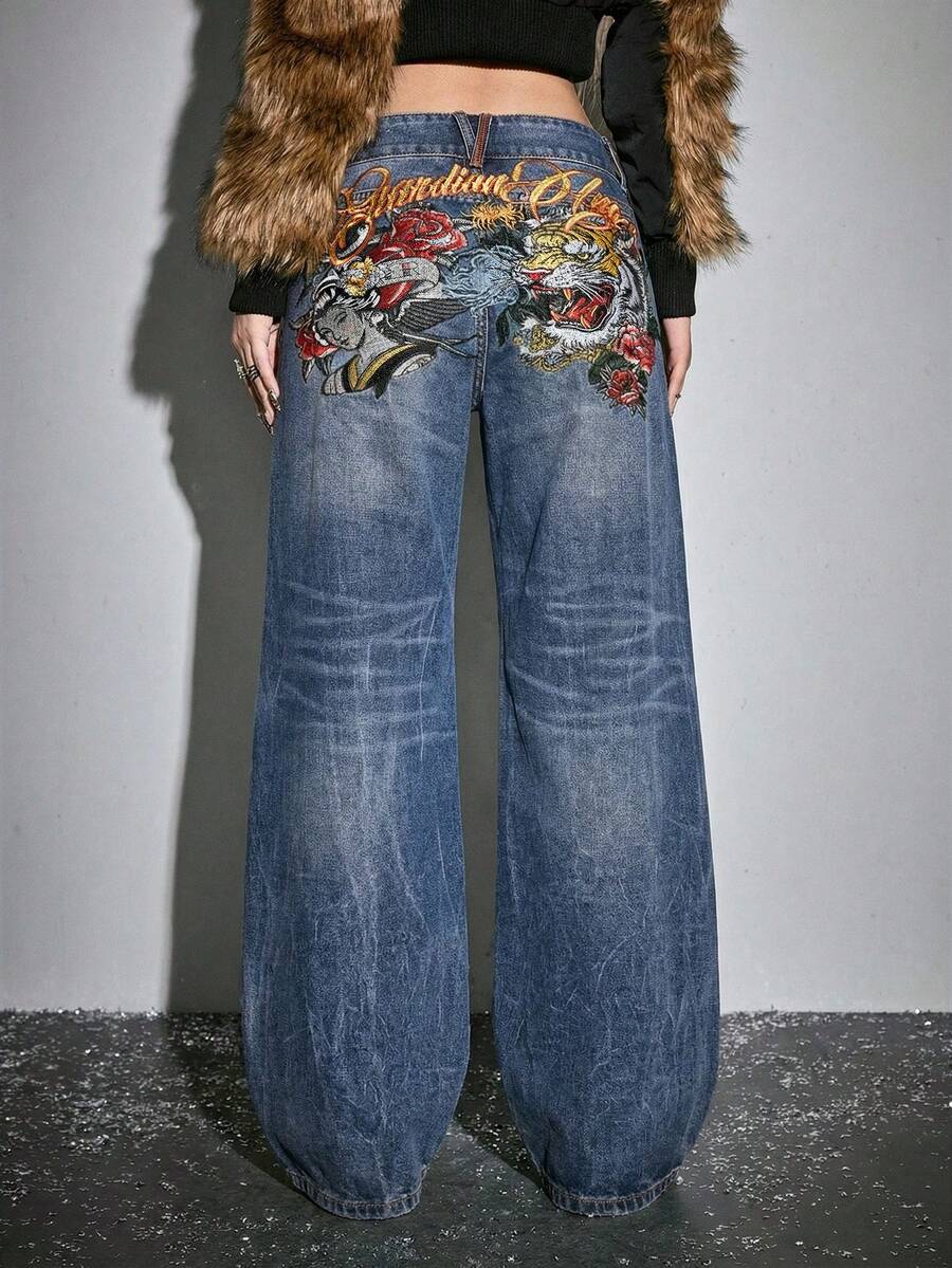 J-Fashion Nuevos jeans de mujer de cintura baja con bordado en inglés de figura de geisha con cabeza de tigre, estilo chino retro de otoño/invierno