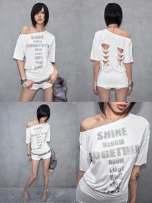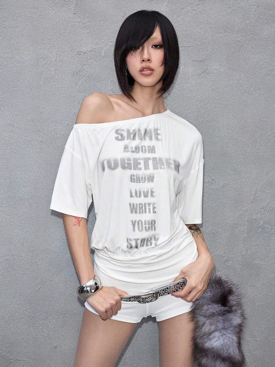 J-Fashion Camiseta de mujer de manga corta con hombros descubiertos, estampado de letras y efecto tie-dye sexy