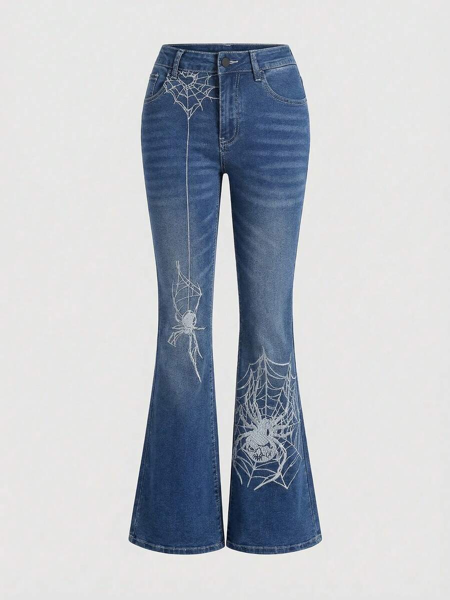 J-Fashion Jeans de mujer retro y sexy con bordado de araña plateada