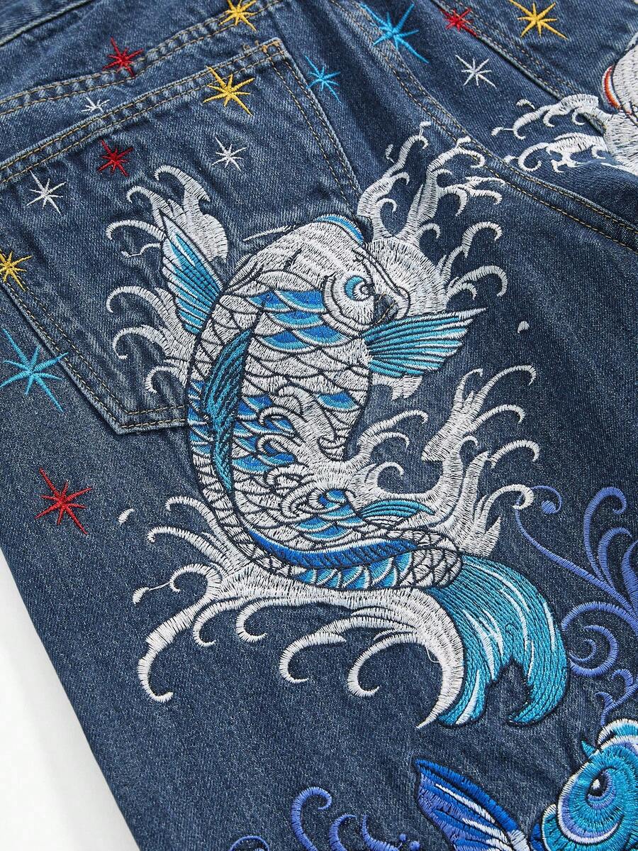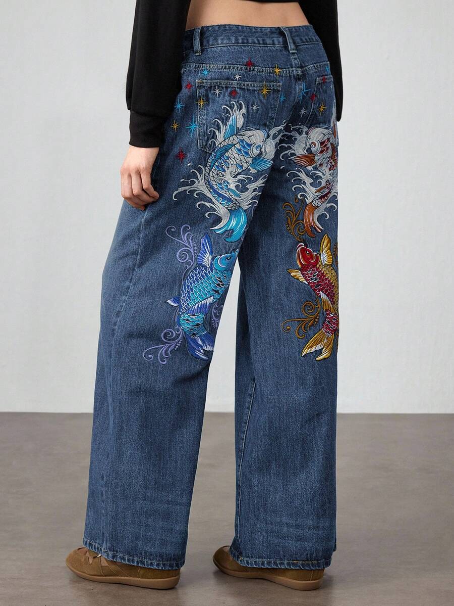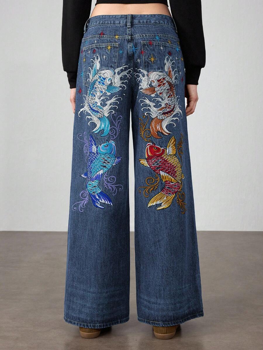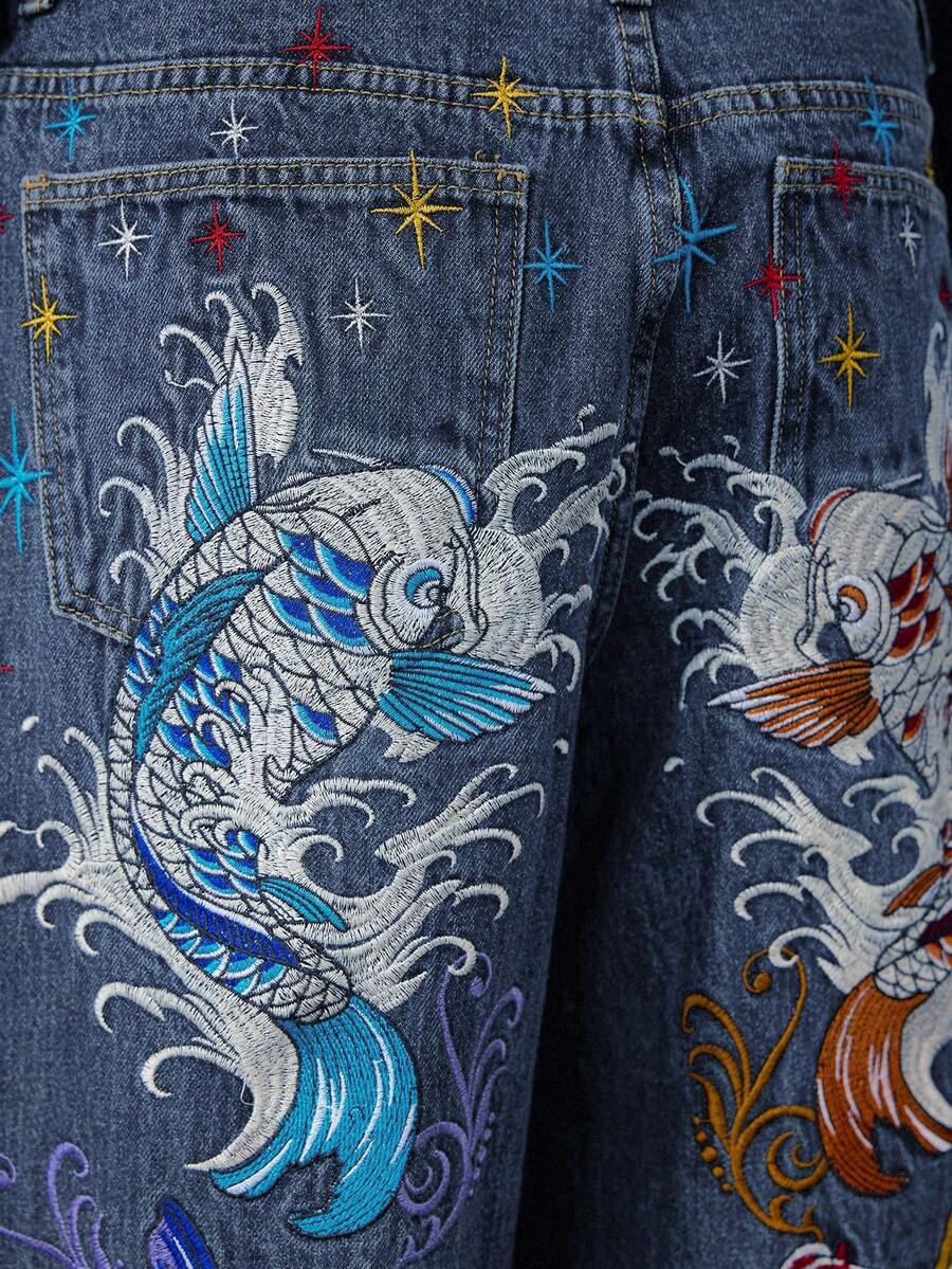 J-Fashion Jeans anchos y holgados con bordado floral de carpa, estilo retro hip hop subcultura, unisex