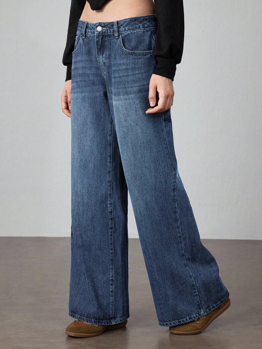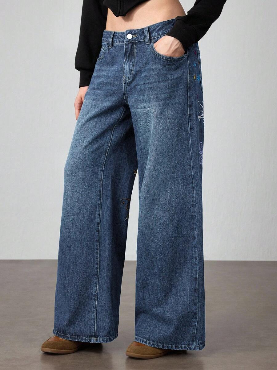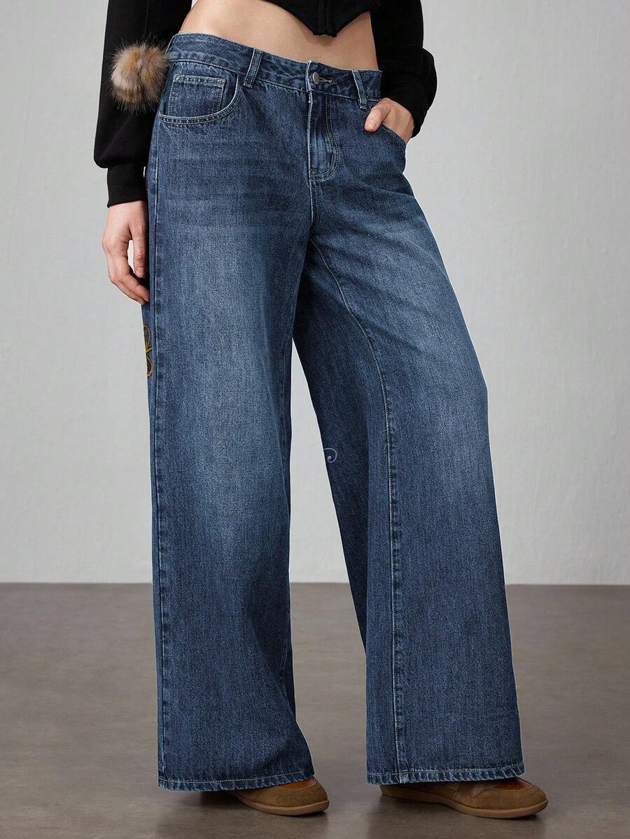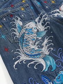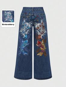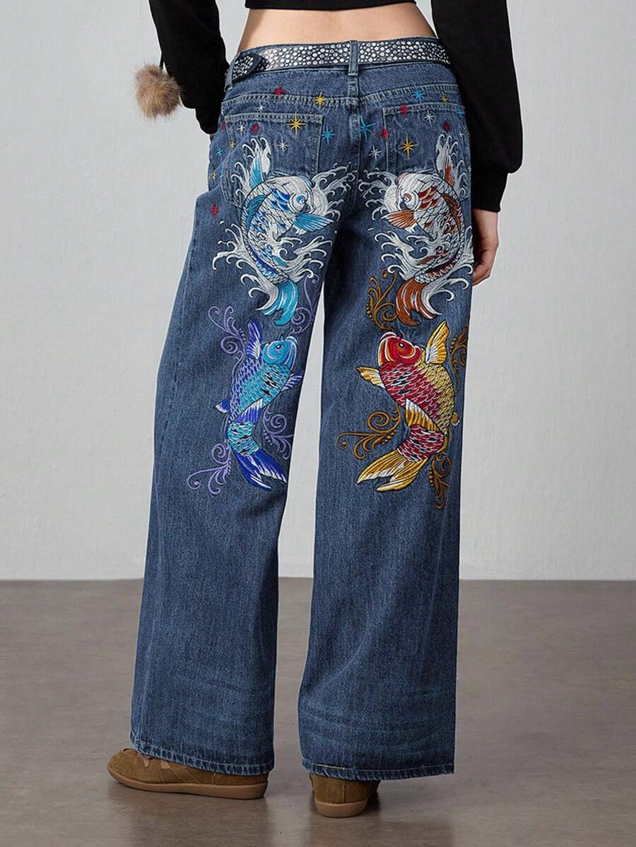 J-Fashion Jeans anchos y holgados con bordado floral de carpa, estilo retro hip hop subcultura, unisex