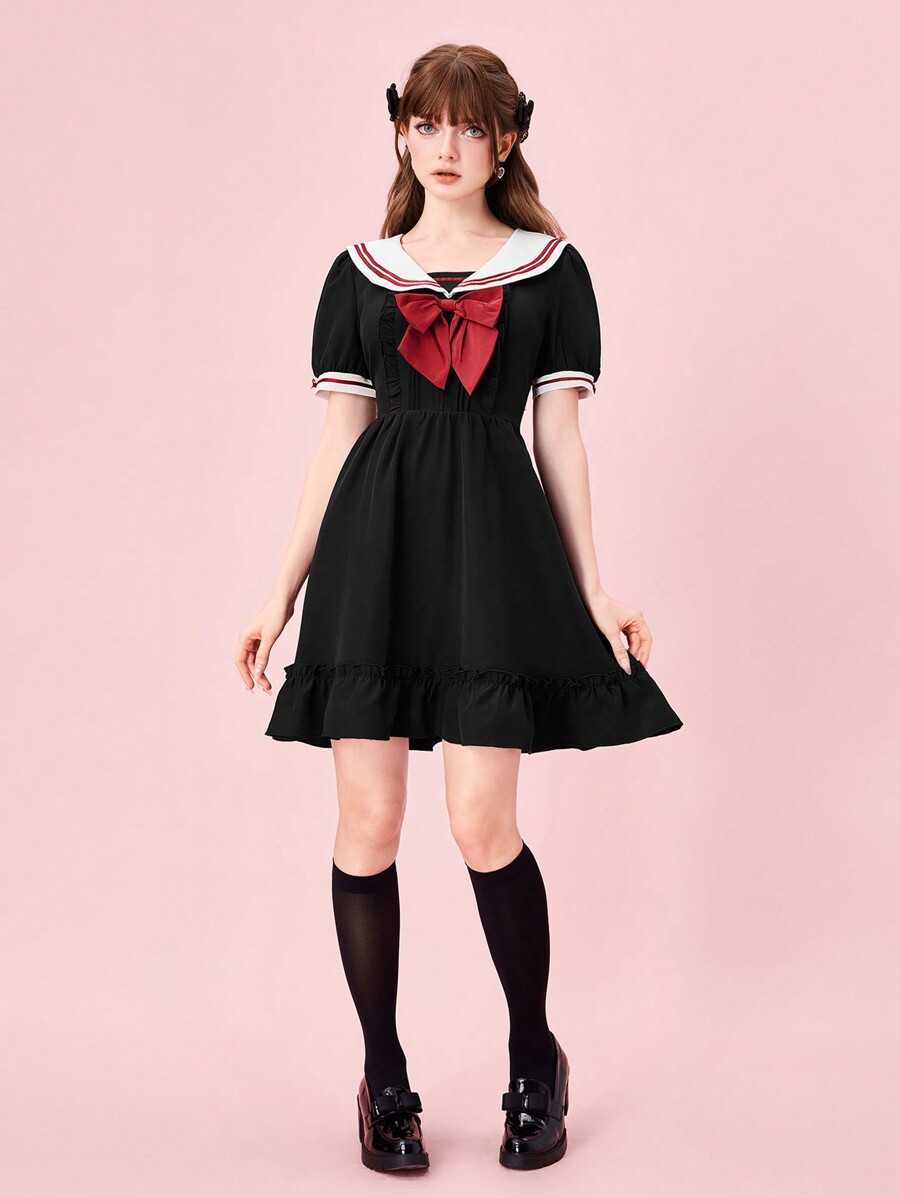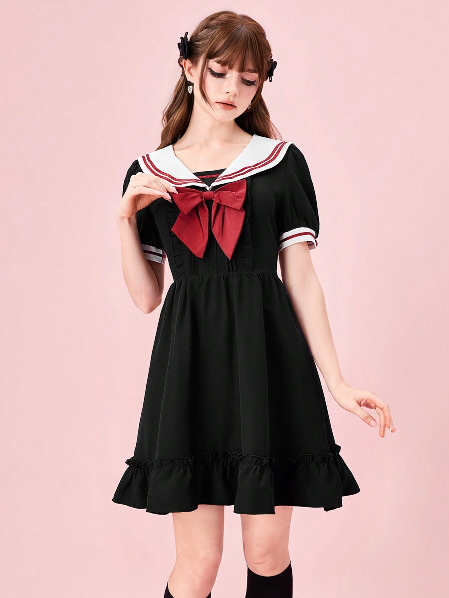 J-Fashion Vestido corto de manga corta con pliegues, decoración de lazo, color contrastante y parche, vestido casual para vacaciones y escuela, para mujer