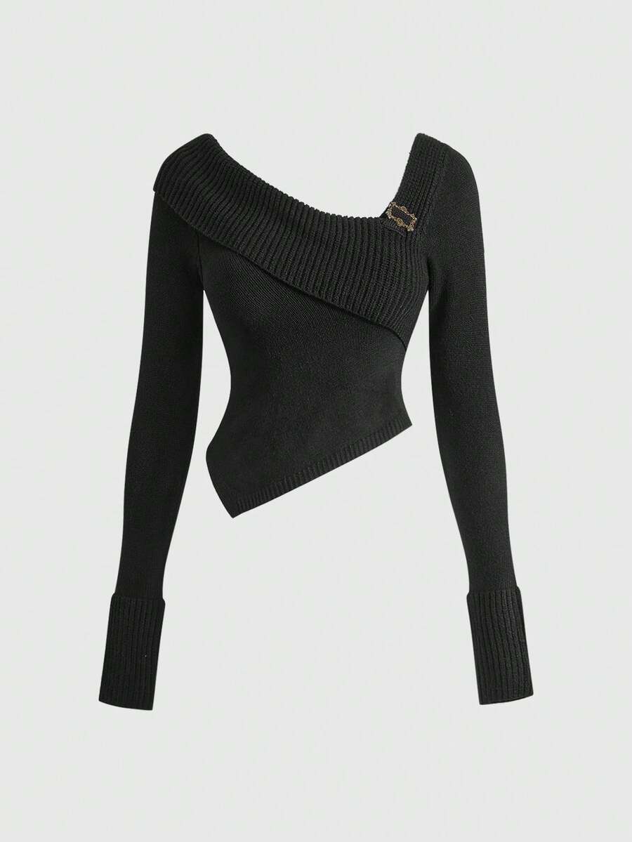 J-Fashion Suéter corto de punto sexy con hombros oblicuos para mujer, estilo de calle con botones decorativos
