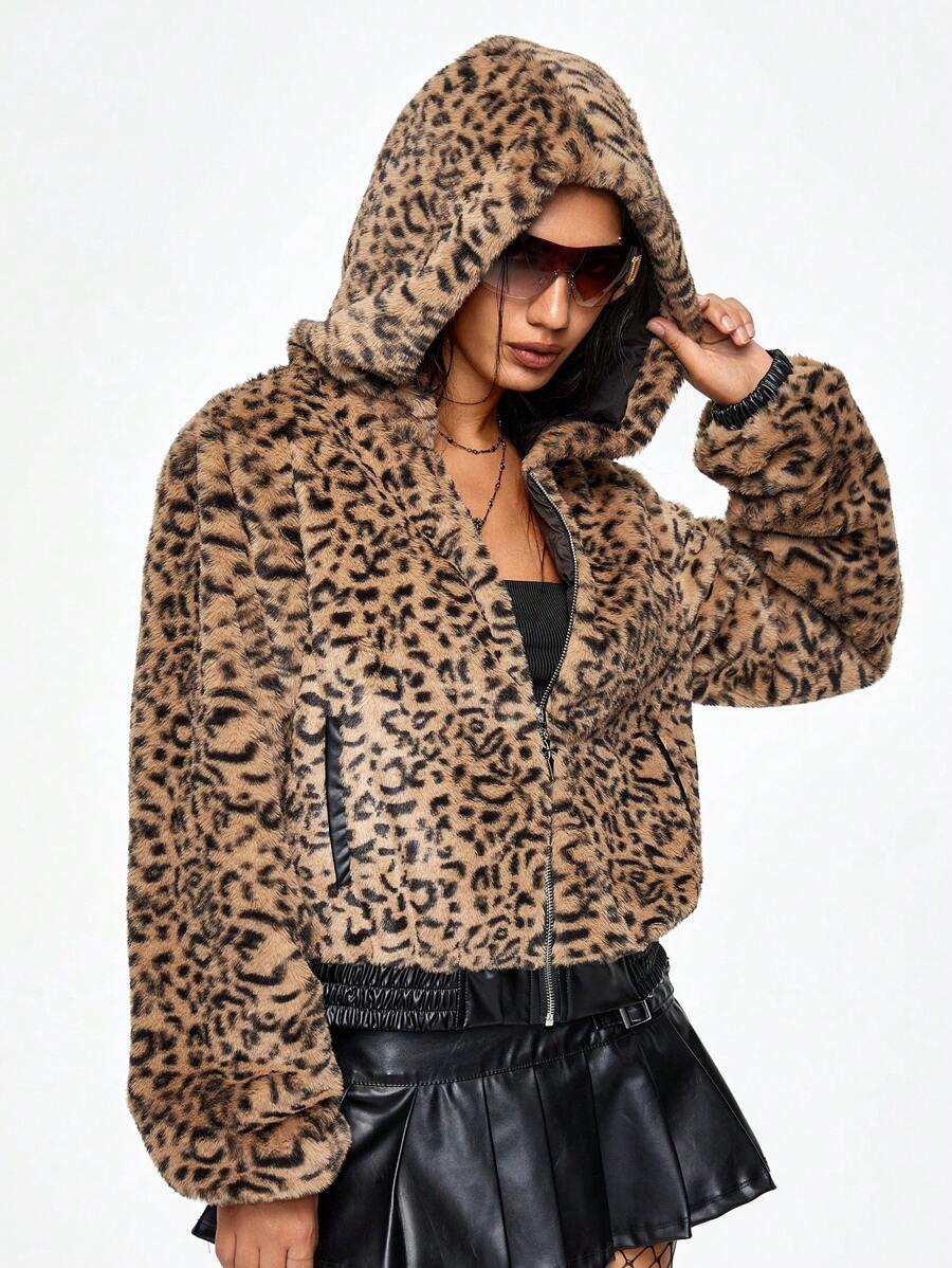J-Fashion Chaqueta de mujer con estampado de leopardo y textura esponjosa
