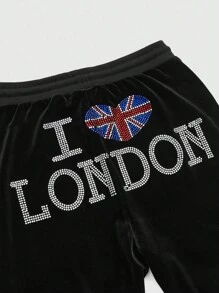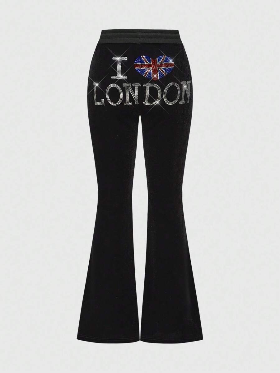 J-Fashion Pantalones de terciopelo acampanados con efecto "I Love London" y strass, de talle bajo, estilo Y2K "Baddie" para mujer