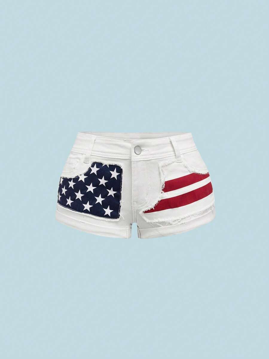 J-Fashion Pantalones cortos de mezclilla de talle súper bajo con estampado de bandera y estrella, moda Y2K