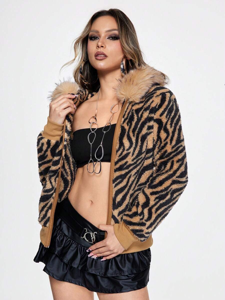 J-Fashion Chaqueta regular con capucha de estilo Gyaru Y2K Harajuku con estampado de cebra y pelo para mujer