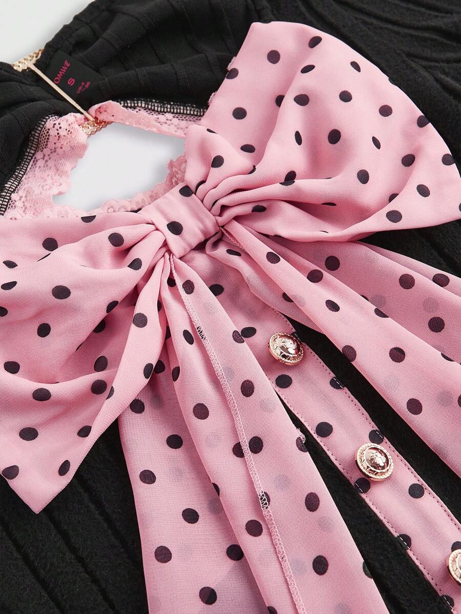 J-Fashion Camisa de mujer estilo Y2K Gyaru Himekaji Harajuku con lazo extra grande y estampado de lunares y encaje 2 en 1