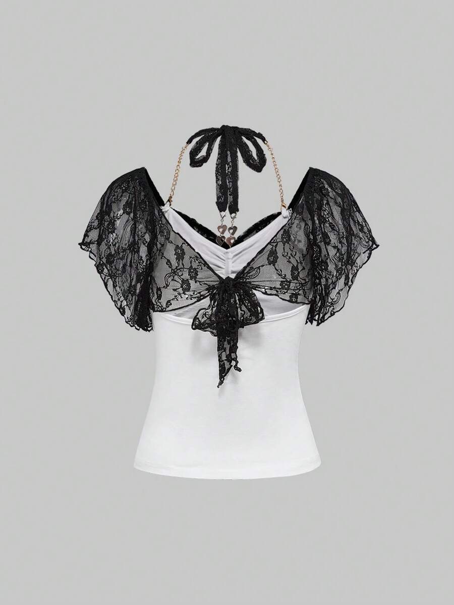 J-Fashion Blusa de manga corta con hombros abiertos y decoración de corazón vintage para mujeres, estilo Harajuku Gyaru Y2K