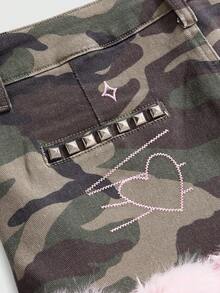 J-Fashion Minifalda de mezclilla de cintura baja con parches de camuflaje picante y textura suave estilo Y2K para mujeres