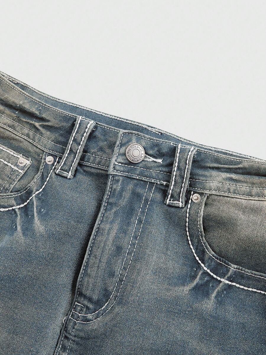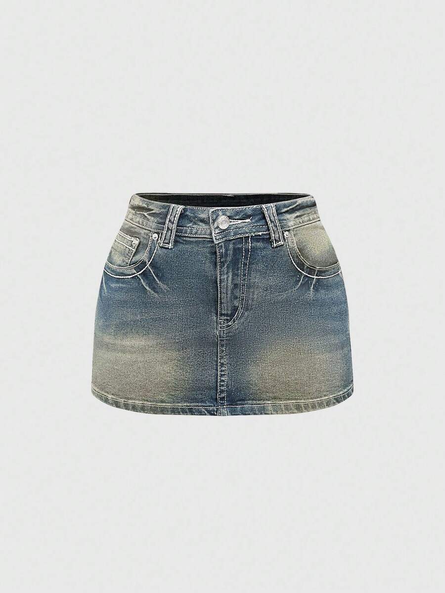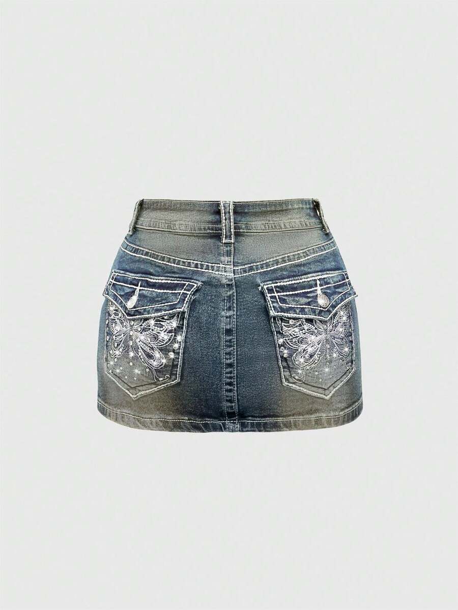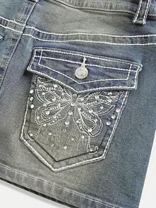 J-Fashion Minifalda de mezclilla con bordado de mariposa de cintura baja ajustable y contraste de color en estilo vintage Y2K para mujeres