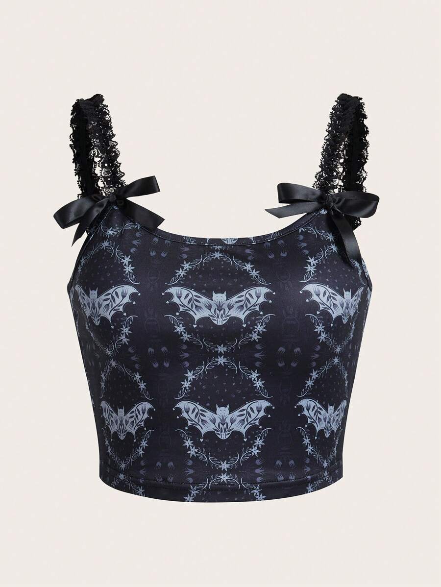 J Marie Creates Top de tirantes murciélagos con estampado con lazo delantero