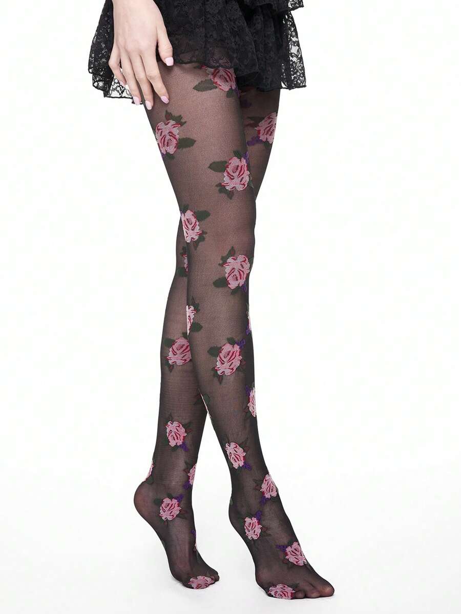 Kawaii 1 par de medias transparentes elásticas con bordado floral retro para mujeres