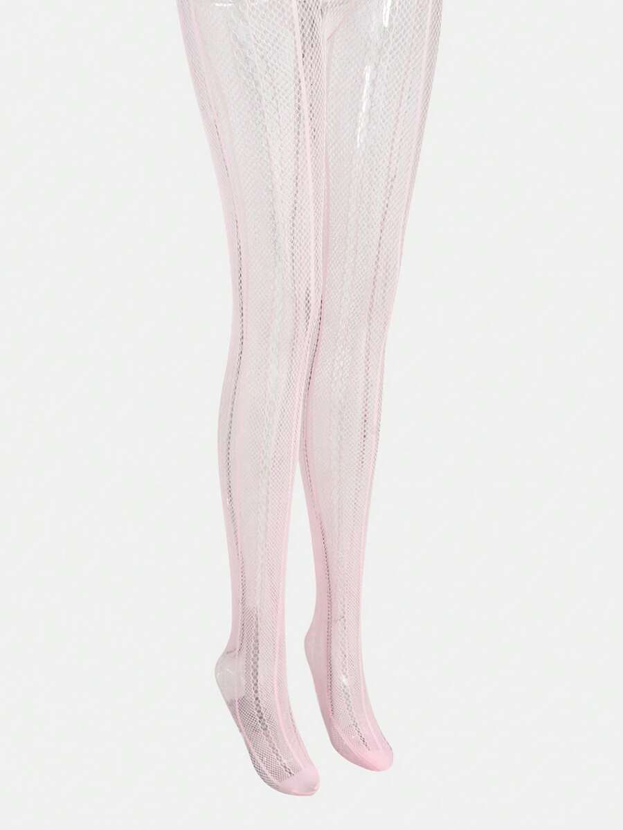 Kawaii 1 par de medias de red verticales huecas y sexys de estilo de chica, pantimedias con estampado geométrico retro de color rosa intenso, leggings elásticos ultra delgados y transparentes