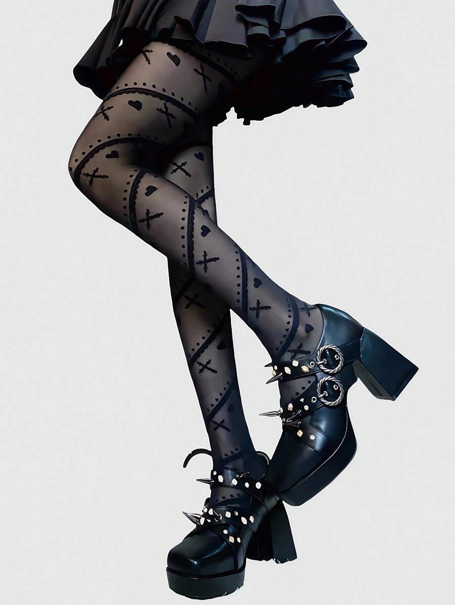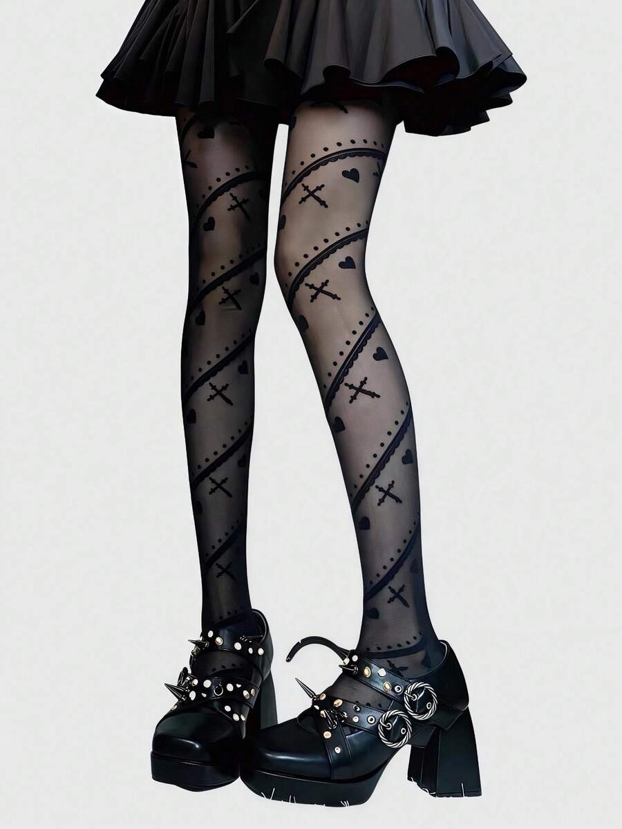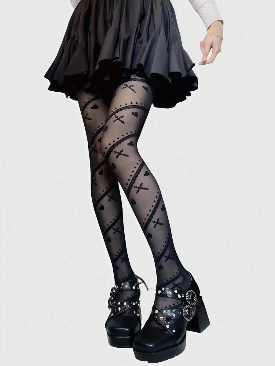 Kawaii 1 par de pantimedia/medias ligeras y transparentes de mujer en color negro con estampados vintage de cruz, lunares, corazones románticos, rayas simples, en estilo punk gótico, adecuado para el estilo lolita, Halloween