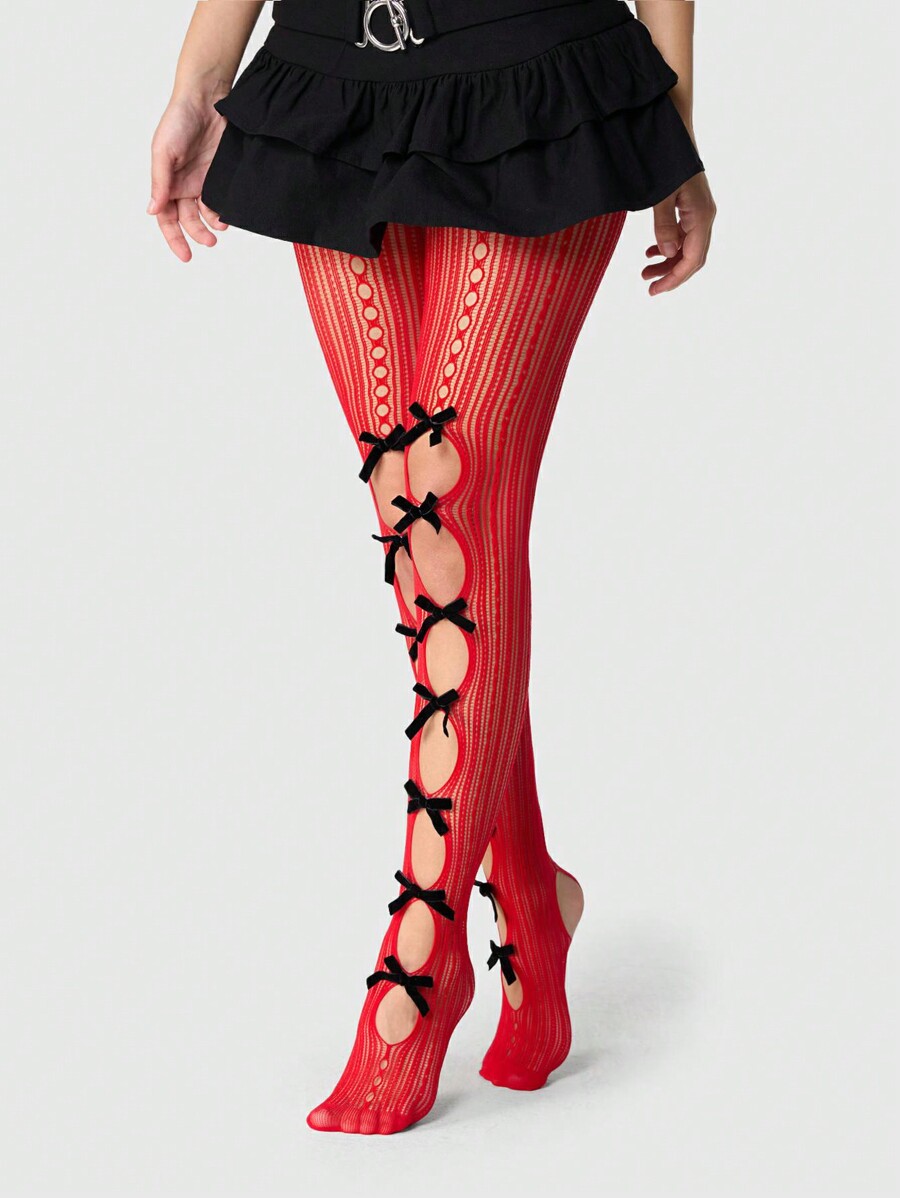 Kawaii 1 par de calcetines de red de doble cara rojos para mujeres con 14 lazos negros, apropiados para todas las estaciones