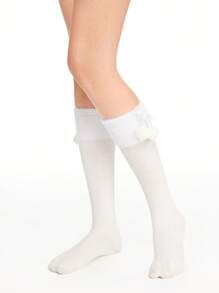 Kawaii 1 par de calcetines cómodos y sencillos de unicolor con pompones hasta el tobillo para mujer