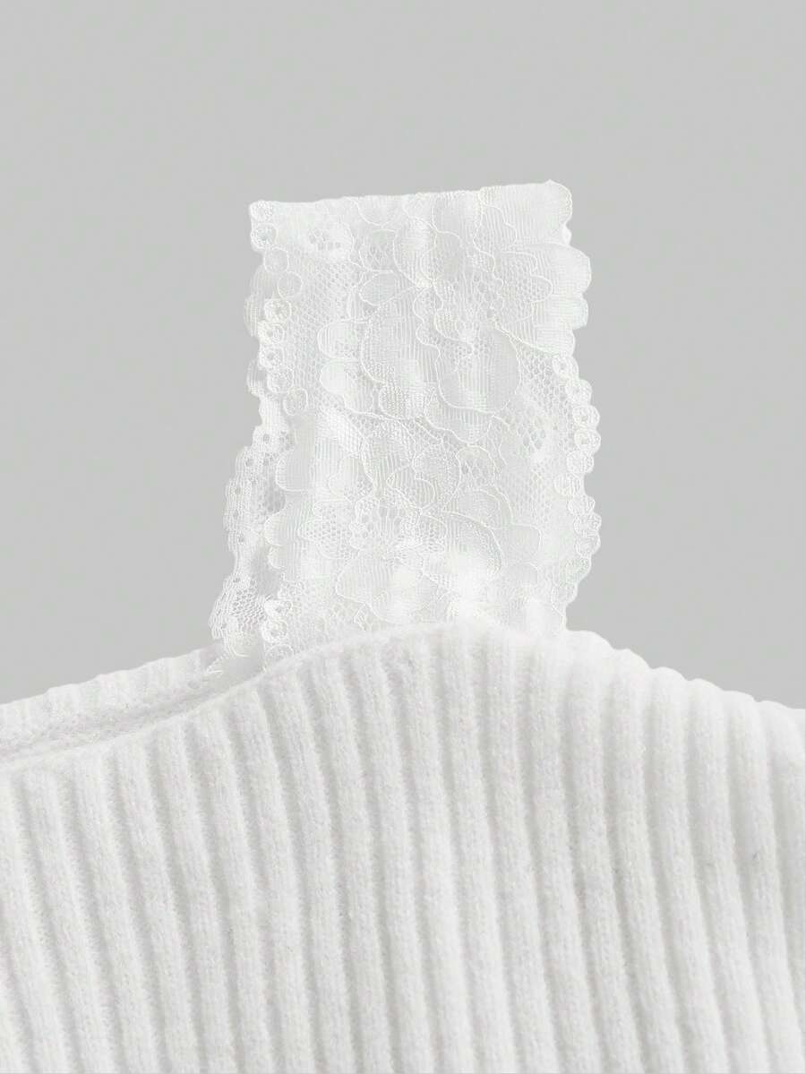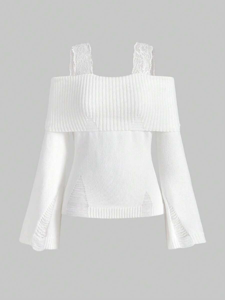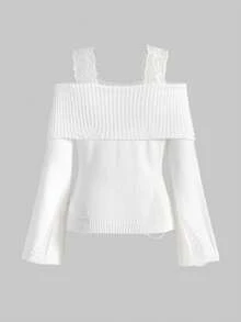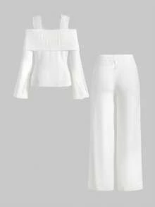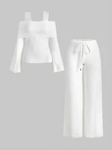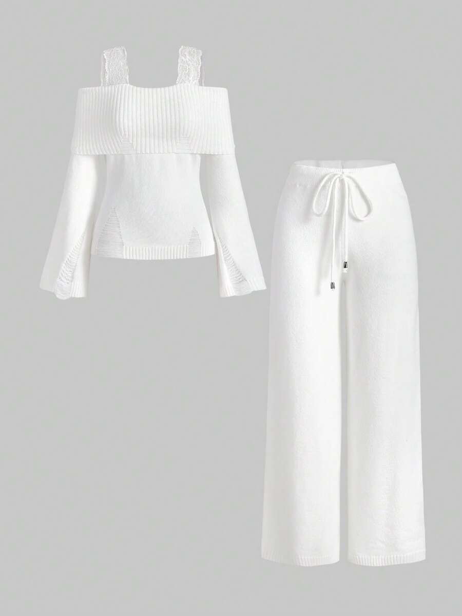 Kawaii 1 Conjunto de Mujer con Suéter Rasgado de Encaje en los Tirantes y Pantalones de Pierna Ancha, Ropa de Estar por Casa Cómoda y Casual